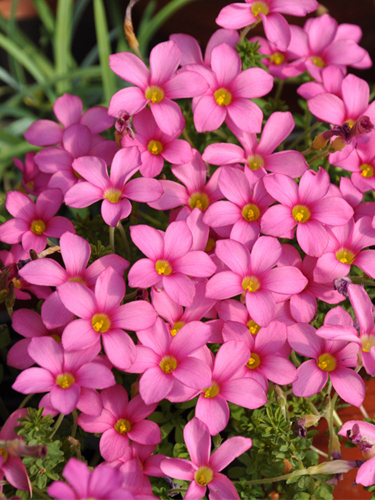 The Oxalis hirta 'Peach' produces an abundance of charming, vivid flowers that blanket the plant. The petals are a delightful shade of rich, deep pink, almost a fuchsia, radiating outwards from a bright yellow center. Each flower is composed of five distinct petals, creating a cheerful, star-like appearance. The sheer volume of blooms creates a striking visual impact, transforming any space with a burst of warm color.