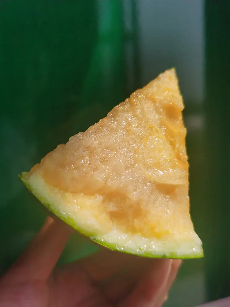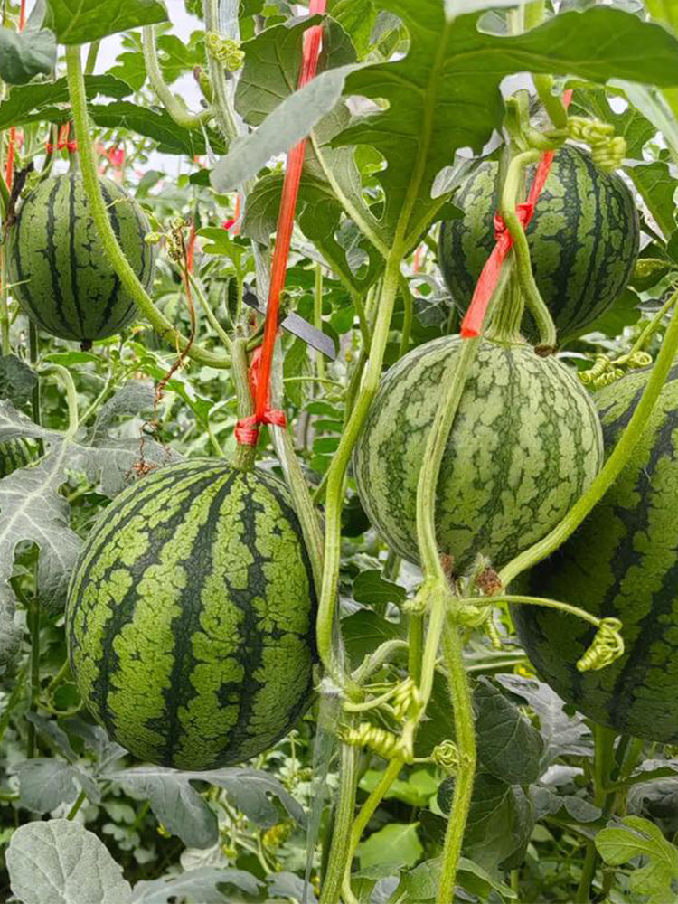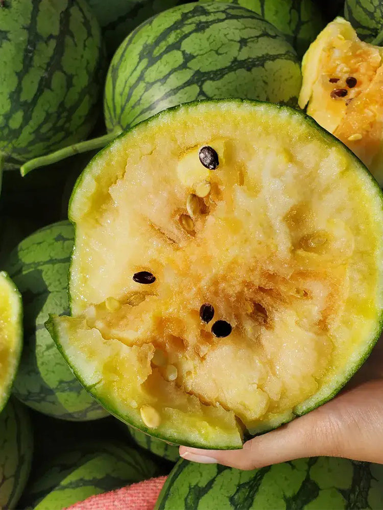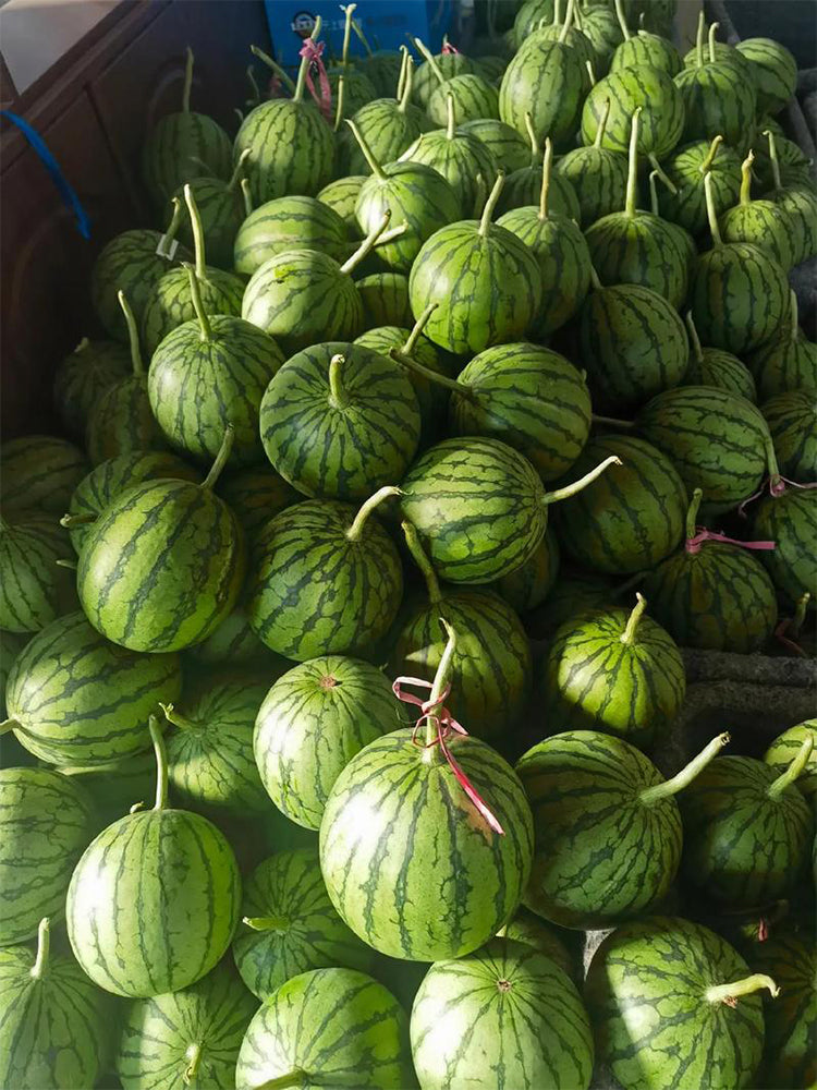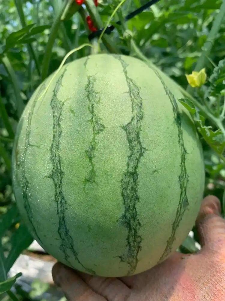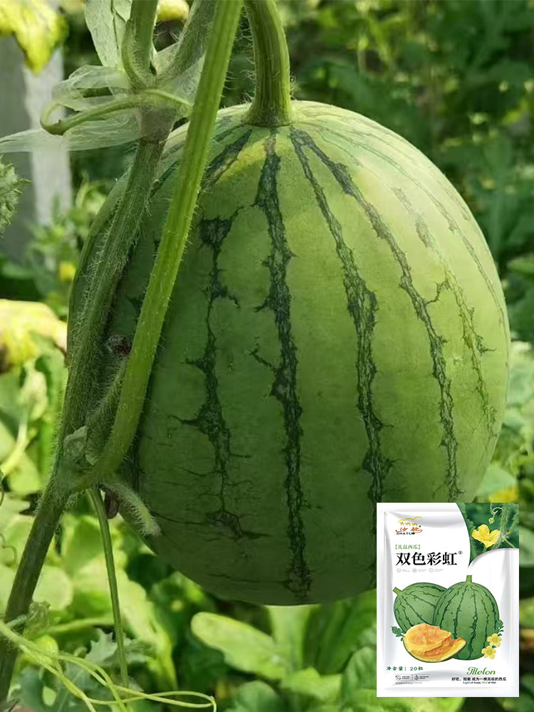 - This early-maturing F1 hybrid gift watermelon variety exhibits robust growth and sets fruit easily. The fruits are ready for harvest 25-28 days after fruit setting. They have an attractive, high-round to oblong shape, with a green rind background covered by distinct dark green stripes. The orange-yellow flesh is crisp, tender, exceptionally sweet, and juicy, with a central sugar content exceeding 13% and a small sugar gradient, which contributes to its excellent taste. The rind is thin yet tough, providing good shelf life. The average fruit weight is 2-3 kg. This variety is suitable for various cultivation methods, including protected structures, greenhouses, and open fields, and delivers stable yields under suitable conditions. However, it is not tolerant to waterlogging or low temperatures.