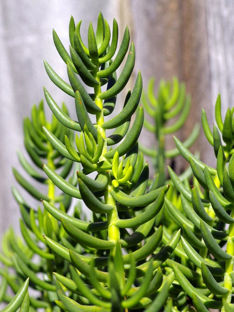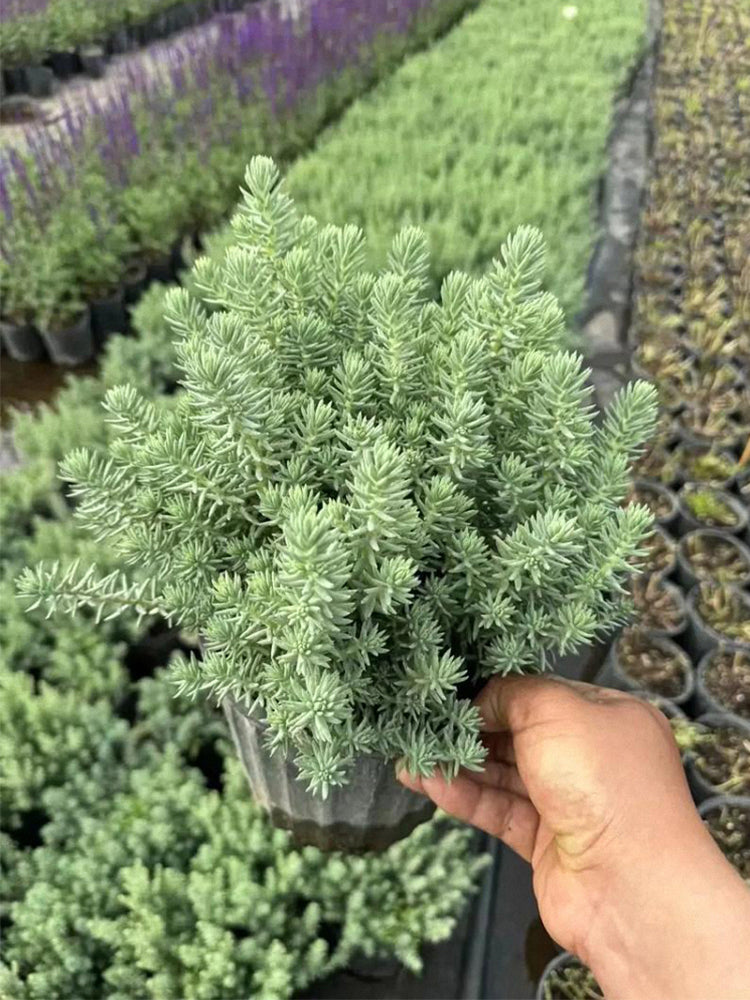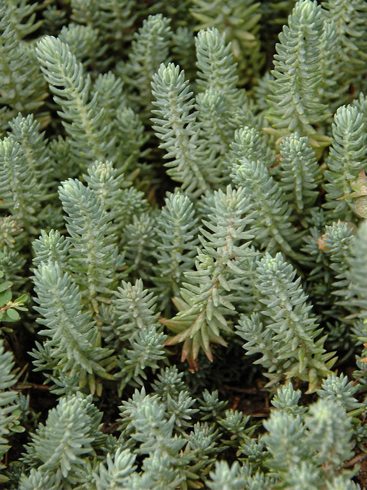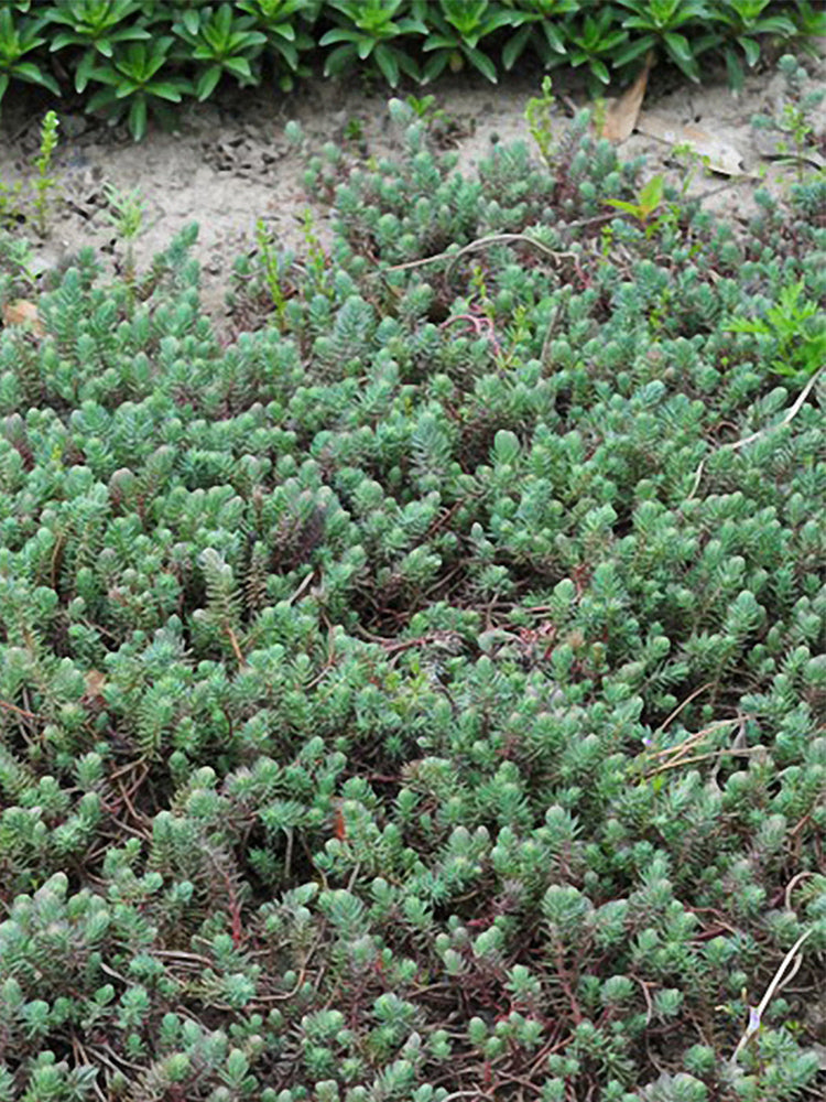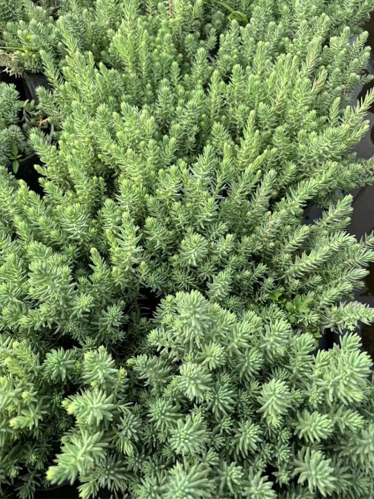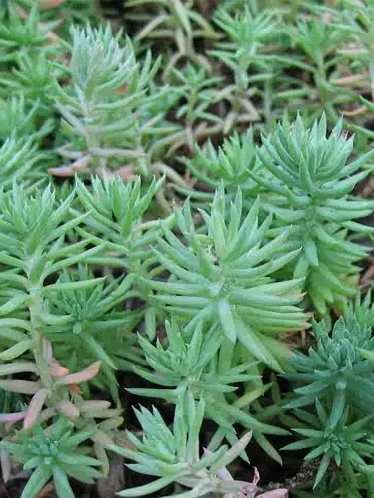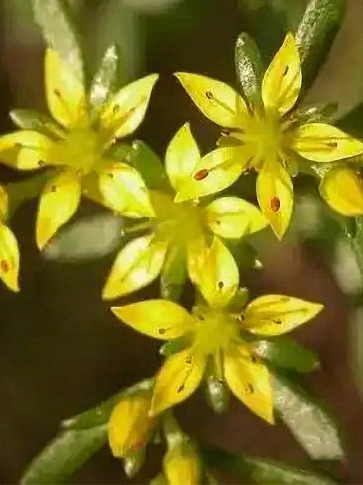 - Reflexed Stonecrop (Petrosedum rupestre) is a perennial herbaceous plant belonging to the genus Sedum in the Crassulaceae family. It grows 15-25 cm tall, with creeping stems that are slightly lignified at the base. Adventitious roots are easily produced at the nodes, and the plant forms a slightly clumped growth habit. Its fleshy leaves are alternate and arranged in an imbricate pattern, linear to oblong or linear-oblanceolate in shape. The leaf surface is flat, the dorsal surface is slightly convex, and the apex is sharp and often curved. Covered with a white waxy powder, the leaves appear gray-green, and those on the twigs are arranged like spruce needles. It blooms from June to July, with erect scapes that droop when young, bearing terminal corymbose cymes. The sepals are yellow-green, and the petals are bright yellow and oblong. The flowering branches are firm and upright, and during the fruiting period, the carpels are erect and tan in color.