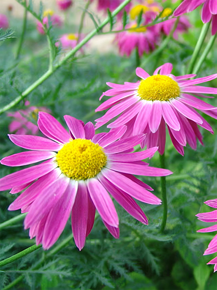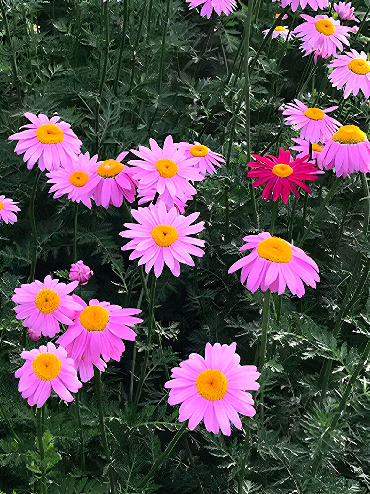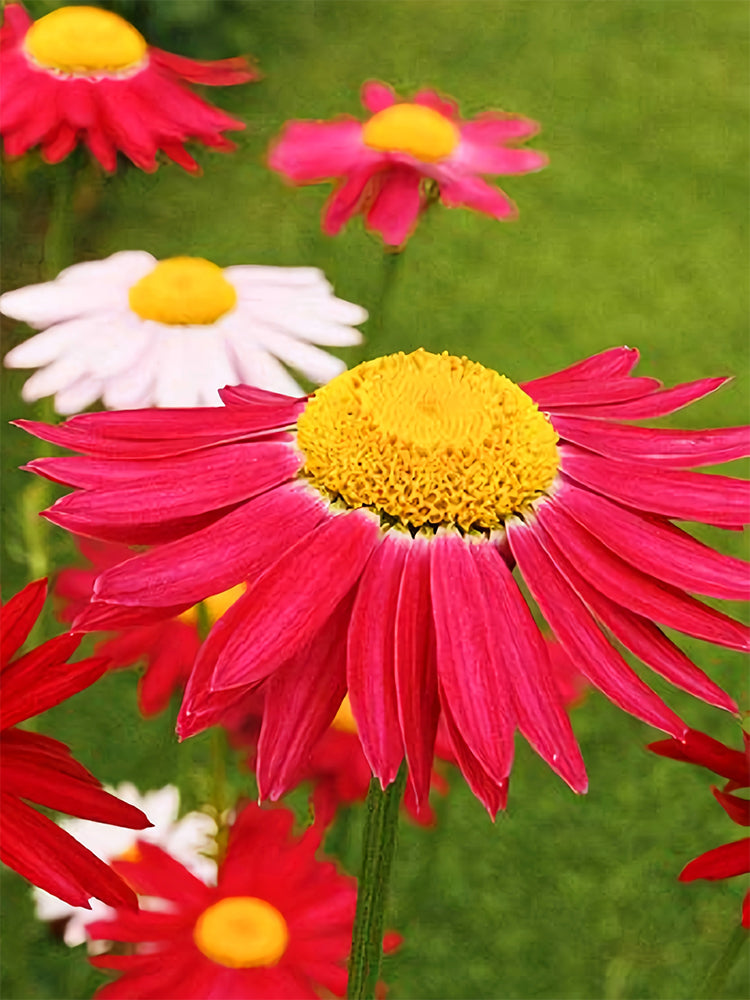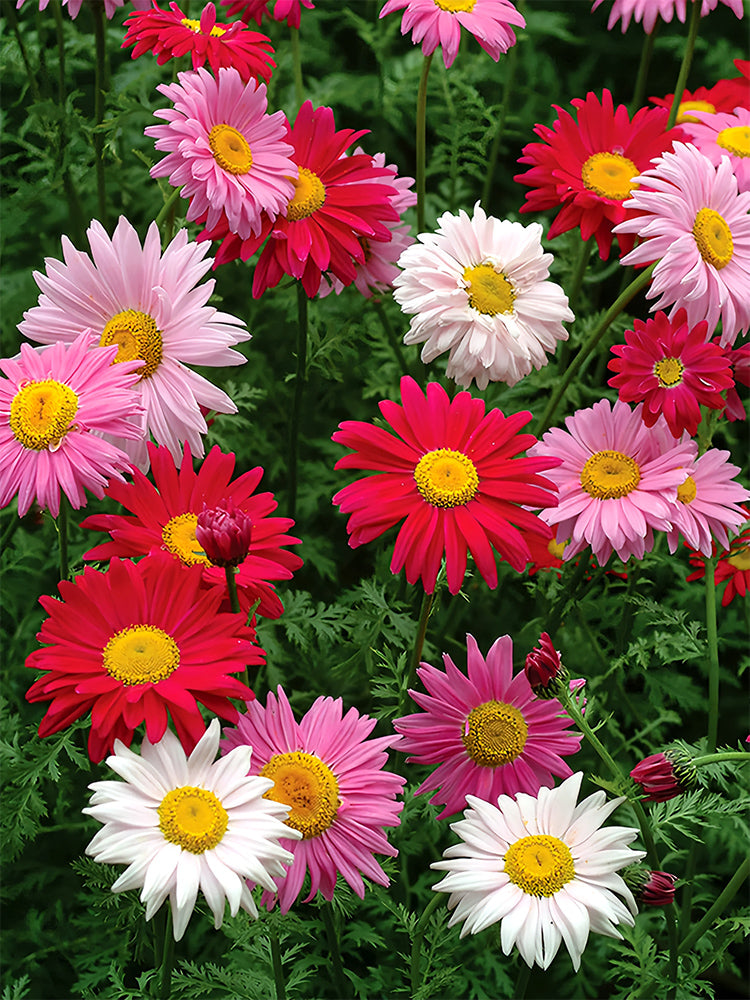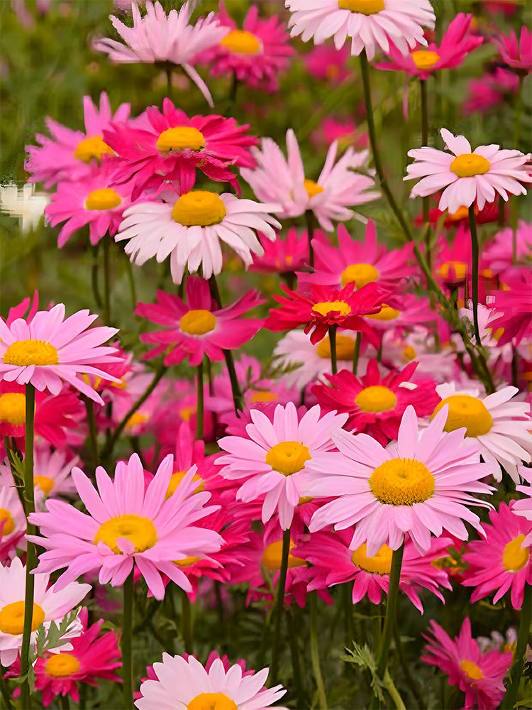 🌱 Radiant Perennials : Pyrethrum Robinson's Mix, also known as Chrysanthemum Coccineum, Pyrethrum Coccineum, Tanacetum Coccineum, or Perennial Painted Daisy, promises a spectacle of colors. From soft pinks to deep reds and pristine whites, each flower boasts a large gold disc at its heart, creating a striking contrast against its finely-divided, evergreen foliage.