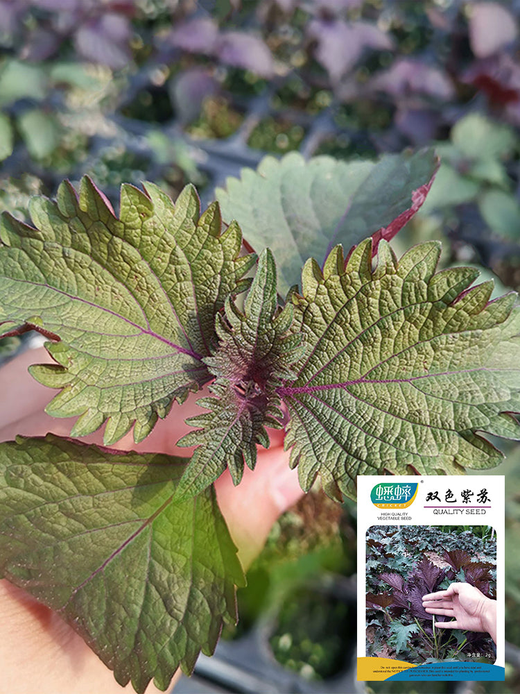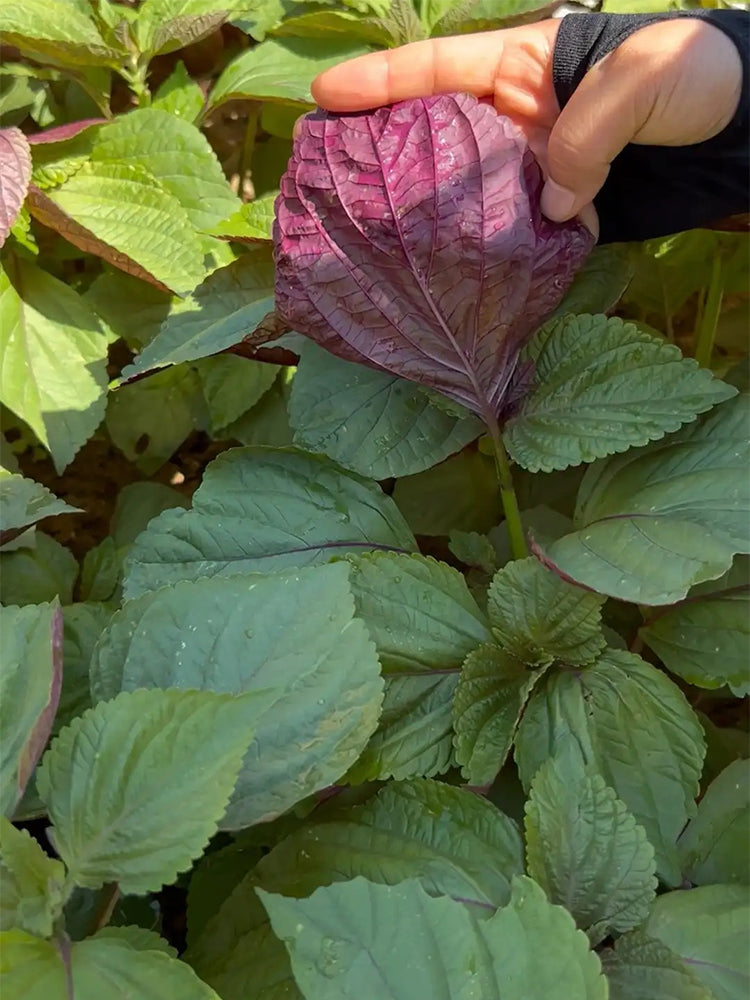 - This distinctive herb boasts high ornamental value with leaves that are emerald green on the upper surface and deep purple on the underside, creating a vibrant and glossy contrast. The soft-textured leaves emit a rich, sweet, and slightly spicy aroma, making them an excellent choice for seasoning. They are also nutritious and have a high oil yield. The plant features rapid growth, strong branching, easy cultivation, and high adaptability. It thrives in warm, humid climates and prefers loose, fertile soil with plenty of sunlight. It is perfectly suited for widespread cultivation in gardens, pots, or growing bases and is also an ideal candidate for organic farms.