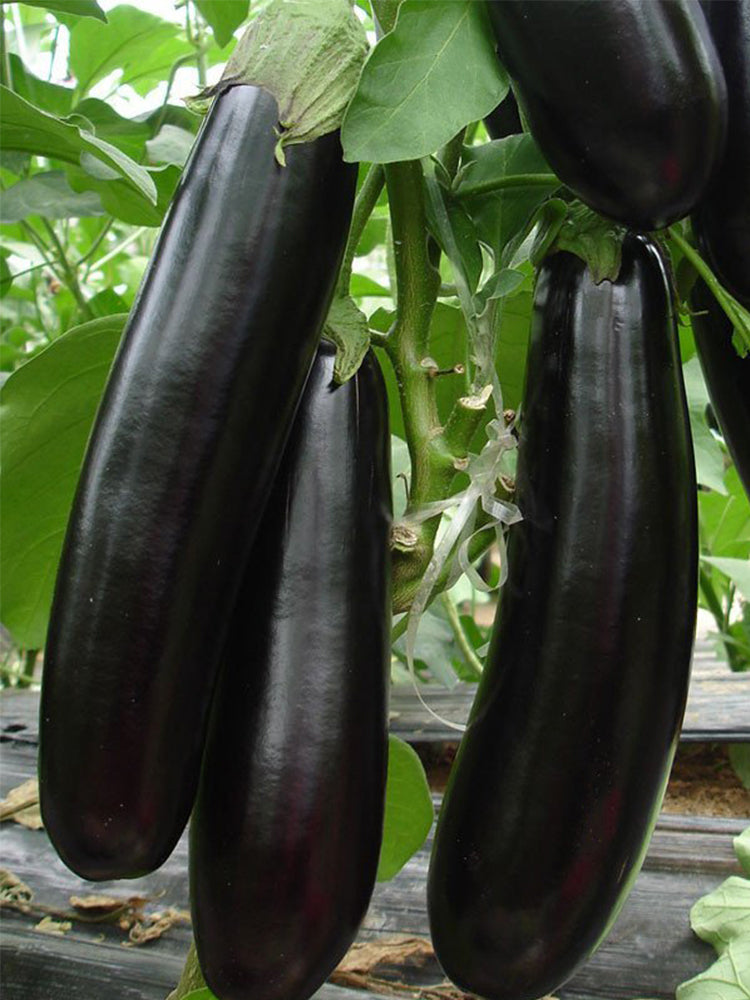 - This F1 hybrid eggplant variety features an upright plant architecture with vigorous growth and high fruit set per plant. The fruits are club-shaped, measuring 25-28 cm in length and about 5 cm in transverse diameter, with an average single fruit weight of 150 grams. They exhibit a purplish-black skin and a green calyx. The flesh is fine-textured, tender, and contains very few seeds, delivering excellent eating quality. The fruits also show good resistance to over-ripening and tolerate storage and transportation well. This variety is particularly recommended for protected cultivation.