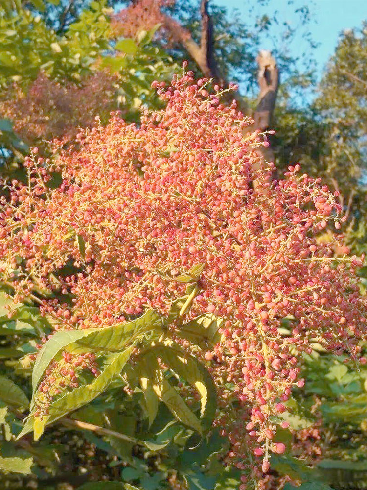 - The tree serves diverse purposes: When parasitized by Chinese sumac aphids (Melaphis chinensis), its young leaves form medicinal galls known as "Chinese gallnuts" (Galla Chinensis). The whole plant exhibits pharmacological effects such as promoting salivation, reducing inflammation, resolving phlegm, relieving coughs, and nourishing pulmonary-renal functions. Its tender stems and leaves, rich in nitrogen, phosphorus, and other nutrients, decompose readily, serving as excellent green manure, edible wild greens, or livestock feed. The flowers provide premium nectar and pollen for apiculture in early autumn. In autumn, its foliage turns crimson while branches bear clusters of orange-red drupes, offering exceptional ornamental value for landscaping. Integrating ecological rehabilitation, economic benefits, and aesthetic enhancement, Chinese Sumac stands as a high-potential multifunctional species.