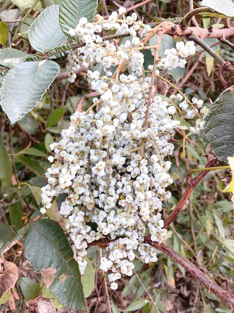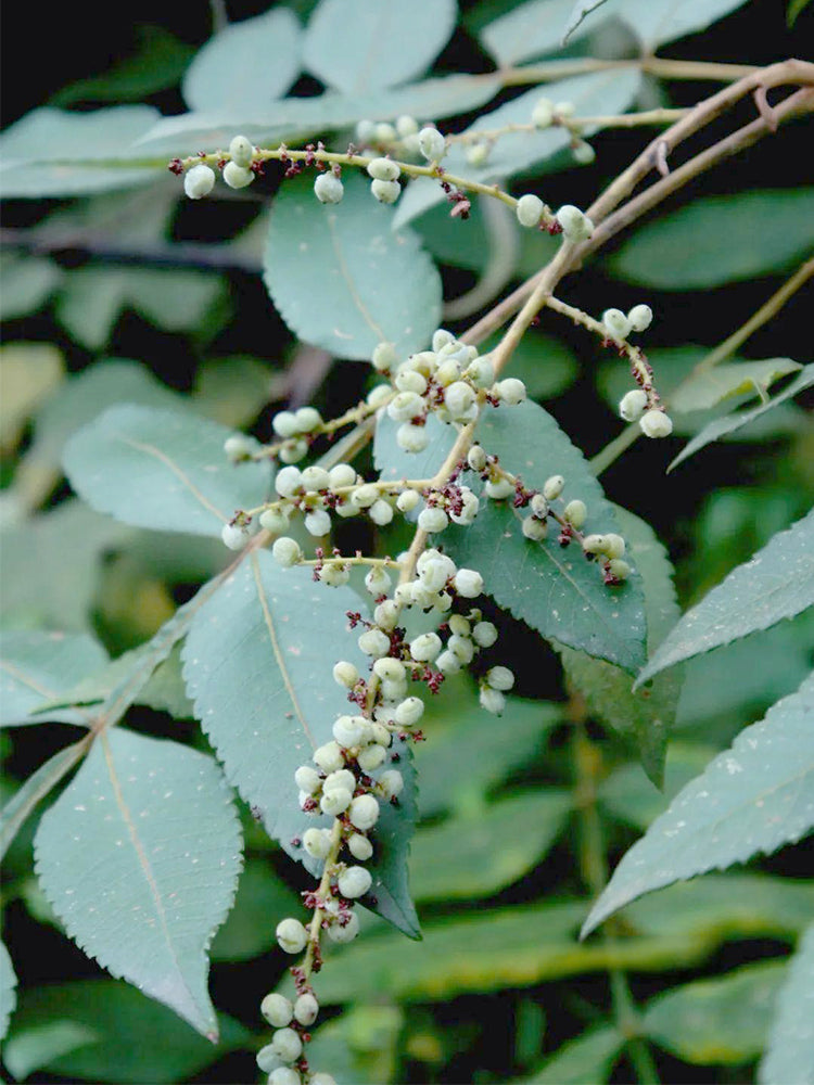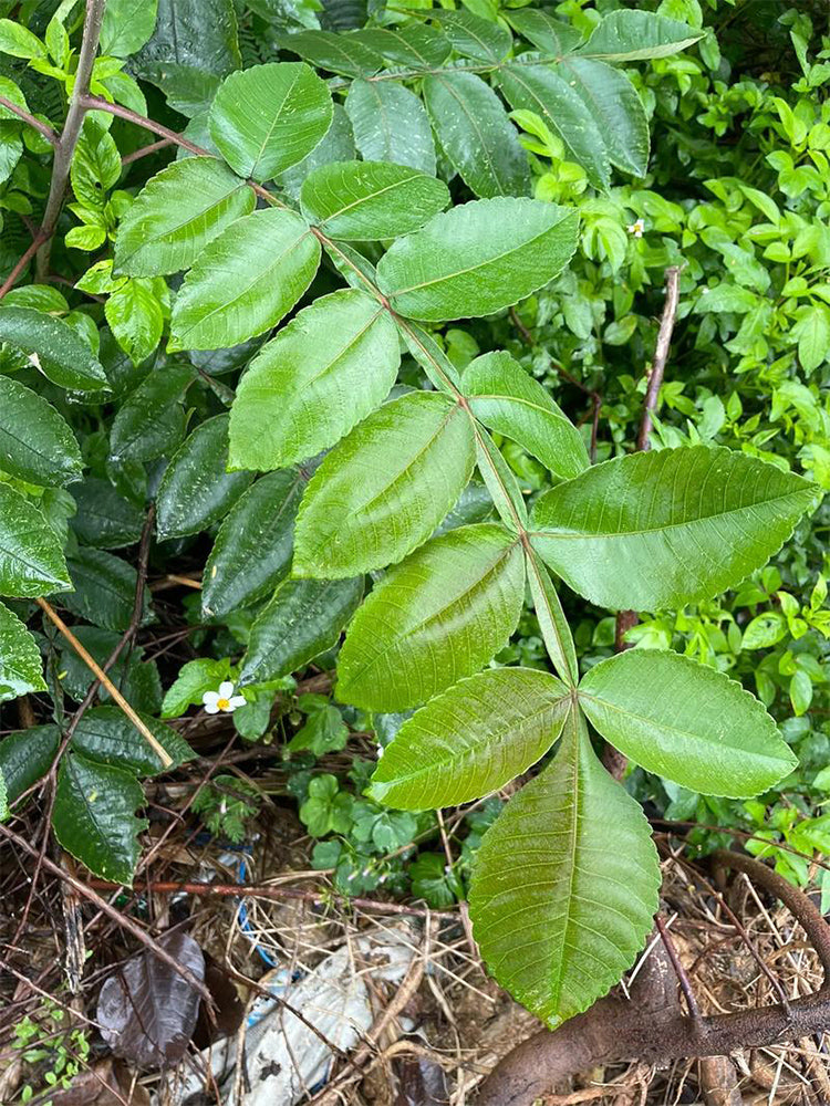 - Chinese Sumac (Rhus chinensis Mill.), a deciduous small tree of the genus Rhus in the Anacardiaceae family, reaches a height of up to 10 meters. Its twigs are brownish-brown, and its leaves exhibit diverse morphology with rounded bases, dark green adaxial surfaces and pale green abaxial surfaces, and are sessile. The panicles are broad and multi-branched, with female inflorescences being shorter and densely pubescent. The white bracts and oblong petals revolute during flowering. The spherical drupes turn red at maturity, with flowering from August to September and fruiting in October. The name originates from its unique ability to absorb soil salts and secrete them as brine onto the plant surface, leaving salt crystals after evaporation.