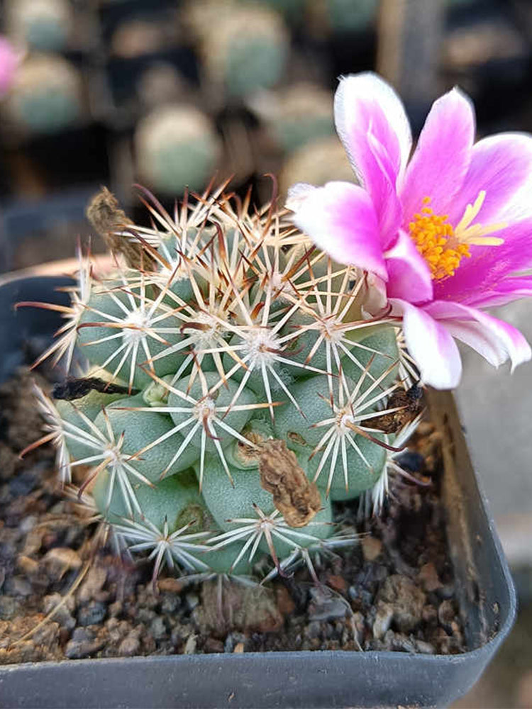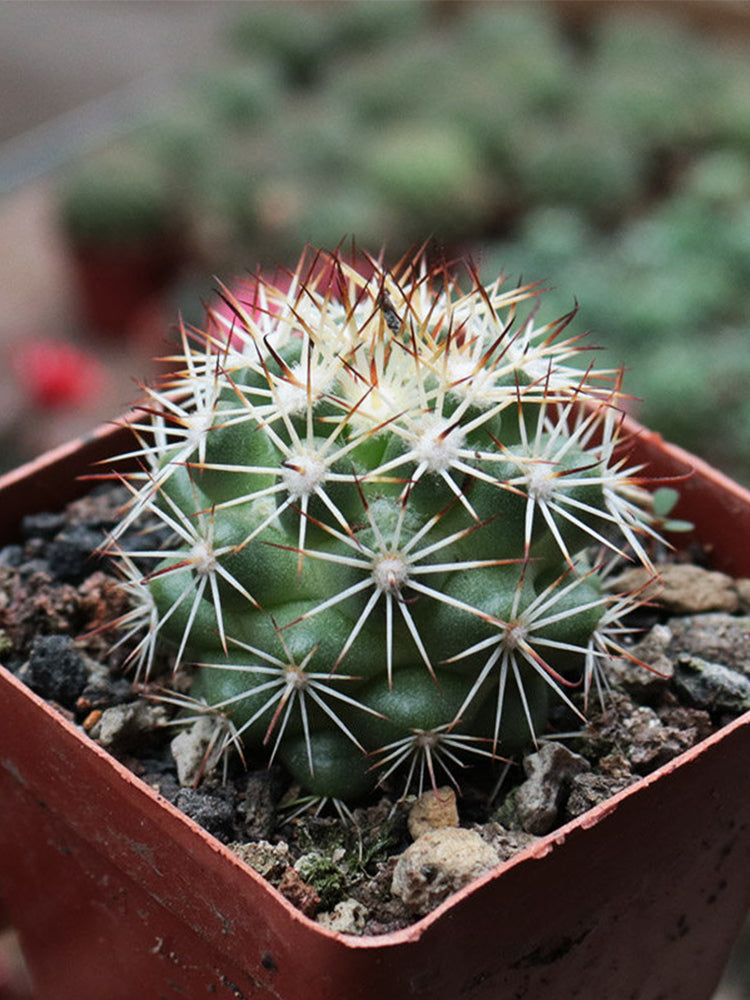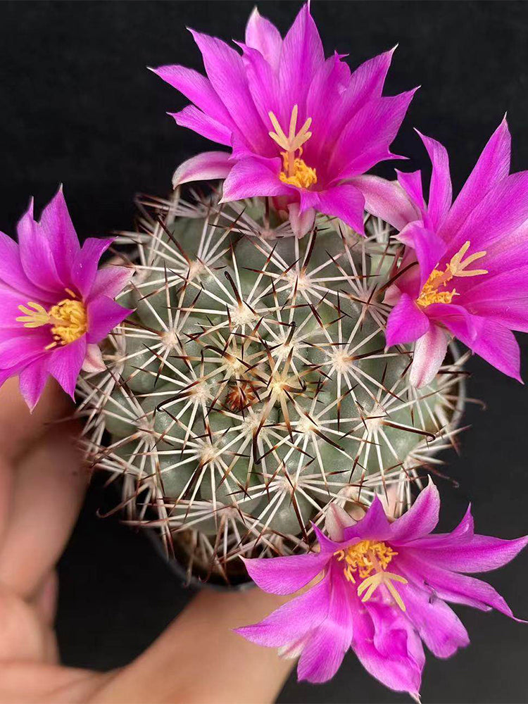 • Distinctive Spine Pattern: 8–10 fine white radial spines per areole, plus 2–4 shorter brown-tipped central spines, forming a delicate, structured star shape