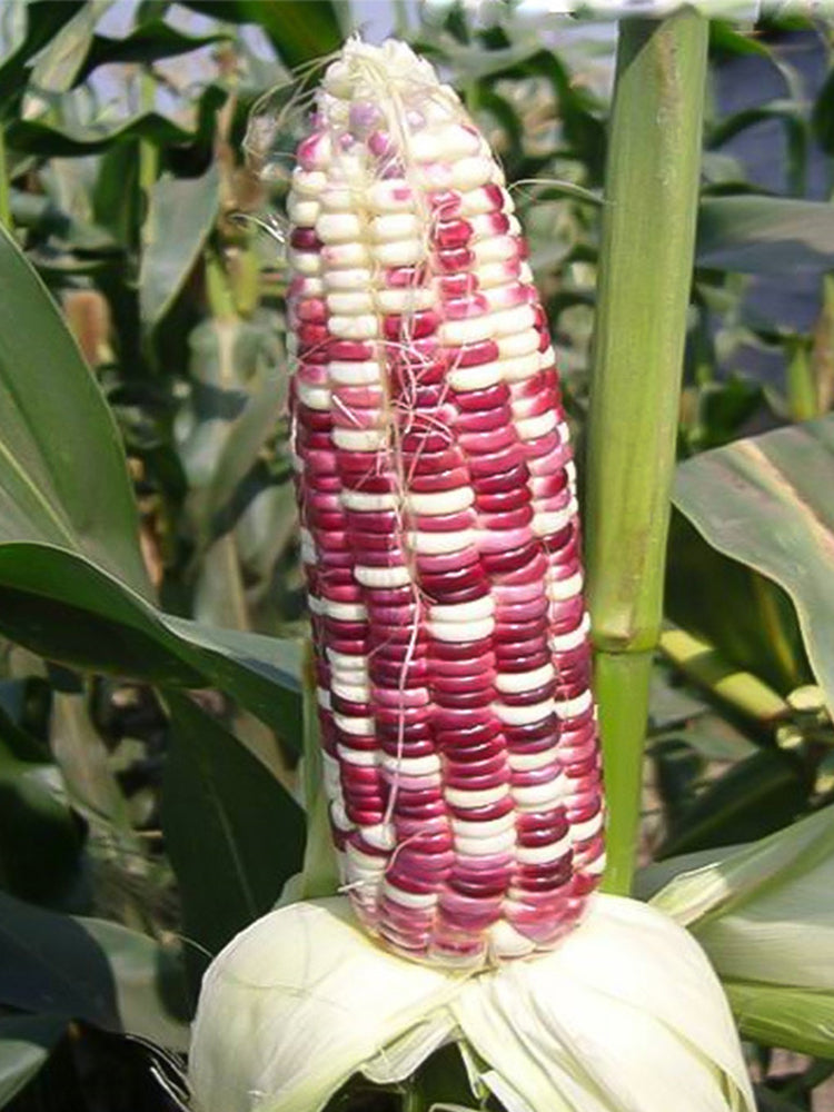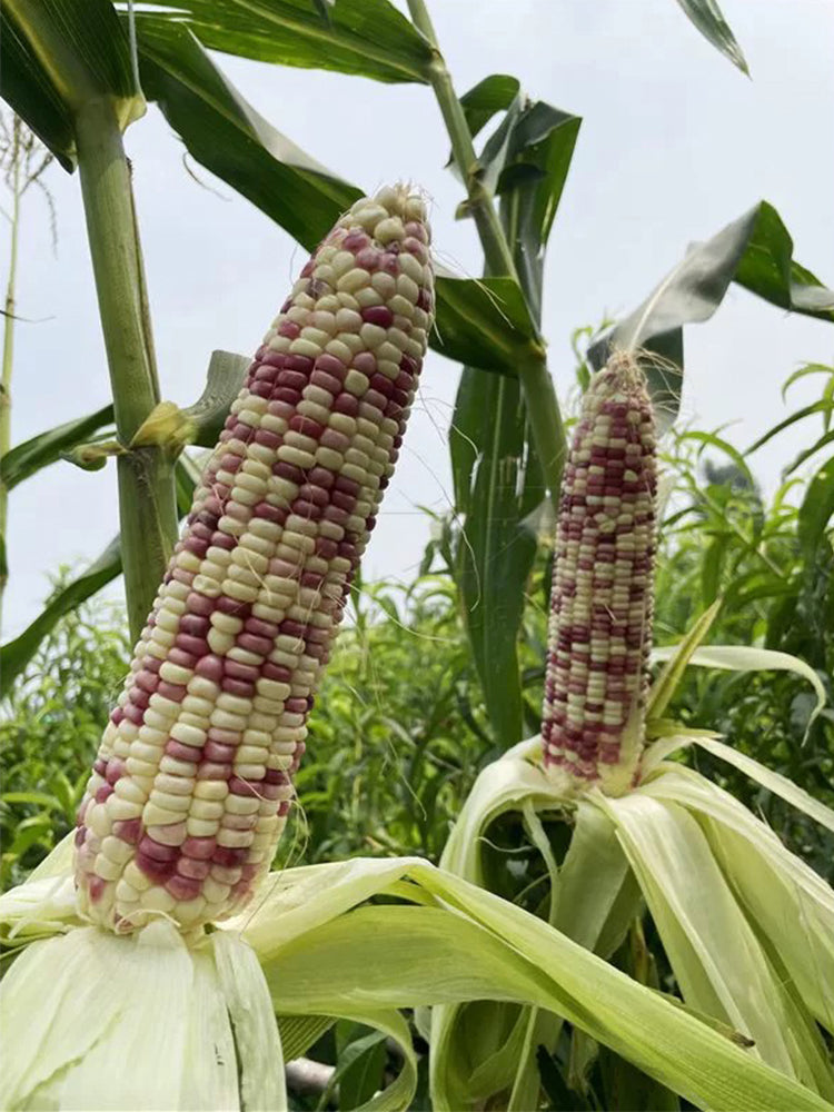 - The variety is non-transgenic hybrid. The plants are semi-compact, the seedling leaf sheaths are reddish and the leaves are green. It takes about 85 - 88 days from seedling emergence to spike harvest. The plant height is about 230 - 280 cm, with an ear height of about 90 - 118 cm. The spikes are cylindrical, about 22 - 22.5 cm long and 5 cm thick, with 14 - 16 rows and 38.5 grains, and each spike weighs about 510 g. The rachis is white. The grains have a purple-white color, and the ratio of sweetness to glutinousness is 1:3, which is sweet and chewy, with high nutritional value. It features high and stable yield, strong disease resistance and lodging resistance, and is suitable for sowing in spring and summer.