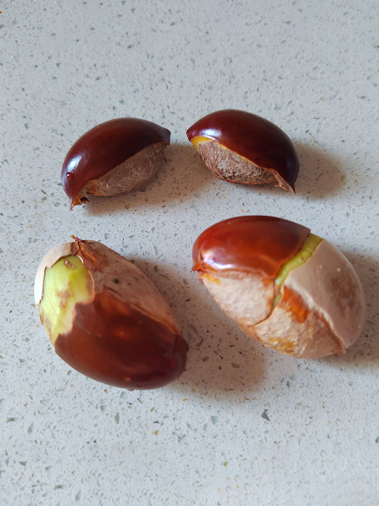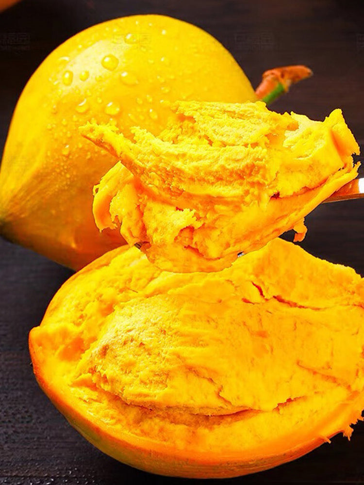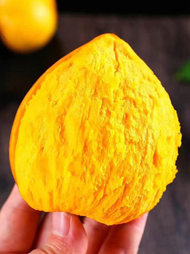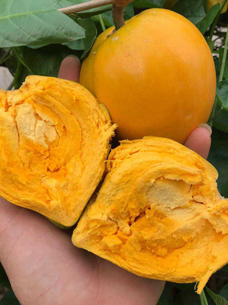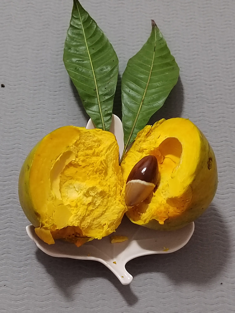 The fruit of the Pouteria campechiana is a distinctive inverted oval shape, transitioning from green to bright yellow when ripe. The outer skin is very thin, while the middle flesh is thick, fleshy, and egg-yellow, offering a flavor similar to that of egg yolk, which is how it gets its name, 'eggfruit'. The fruit ripens in the autumn. The seeds are oval-shaped, yellow-brown, and glossy.