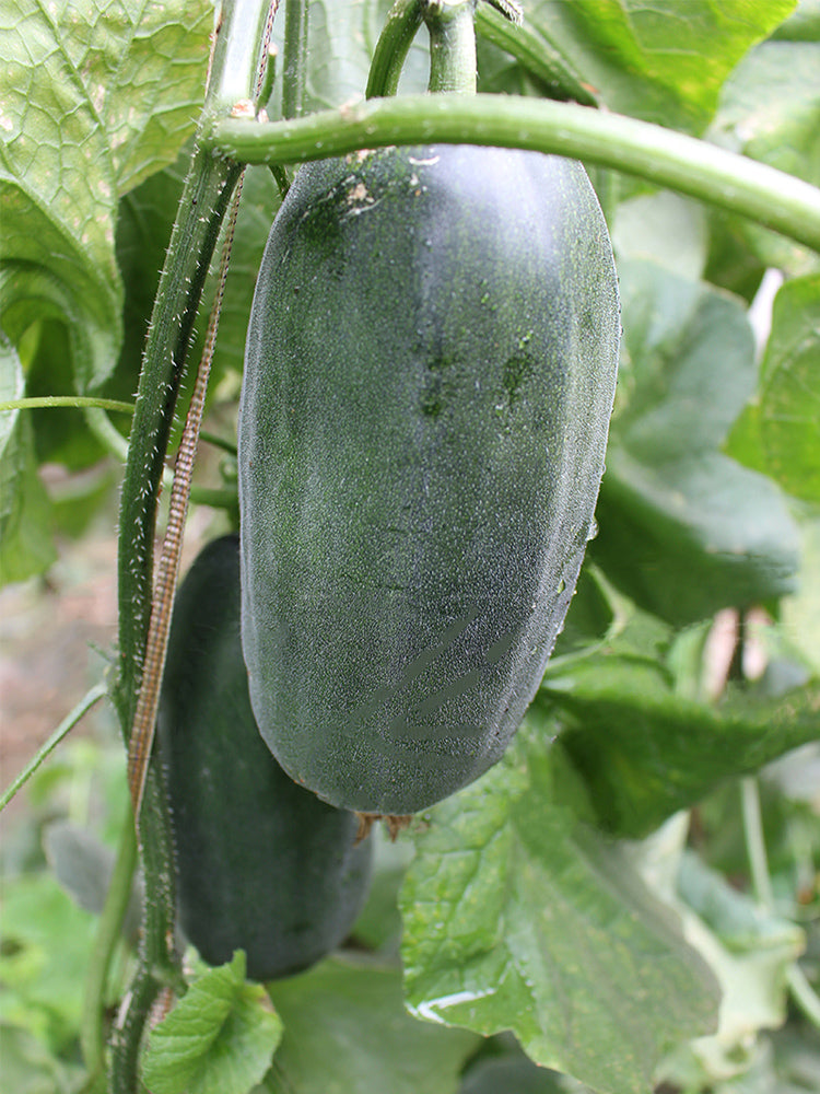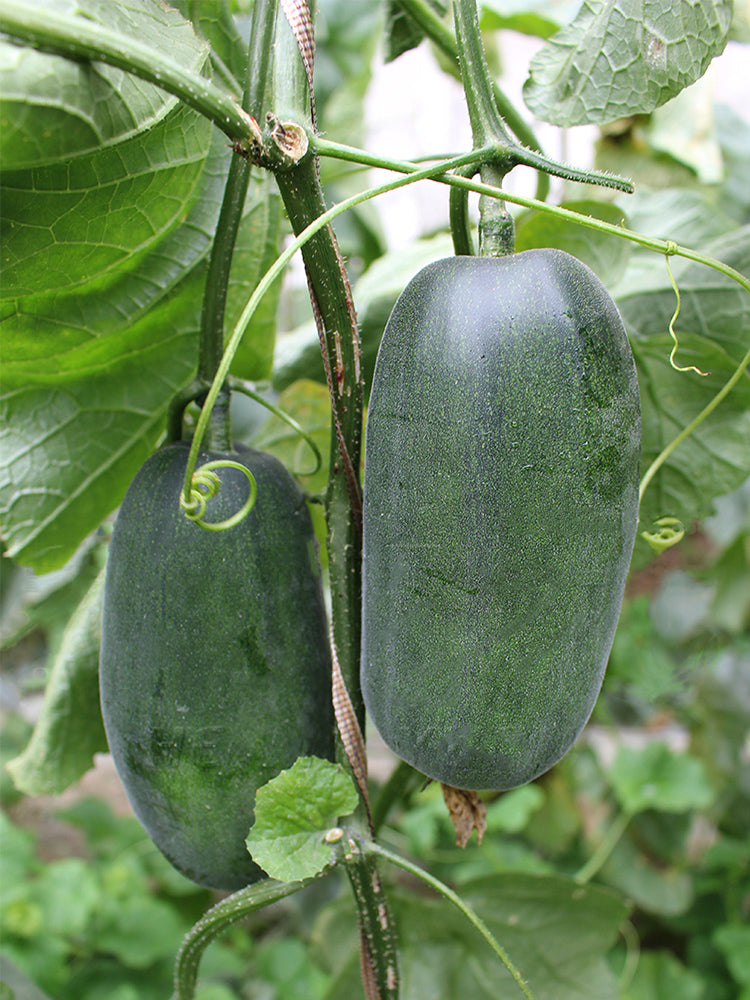 - The fruits are uniform, medium-to-large sized (0.8-1.2 kg each), rod-shaped (15-18 cm in length), with thick, pale green flesh and a small seed cavity. The sweetness level reaches around 14% Brix, delivering a refreshing, crisp texture and excellent flavor.