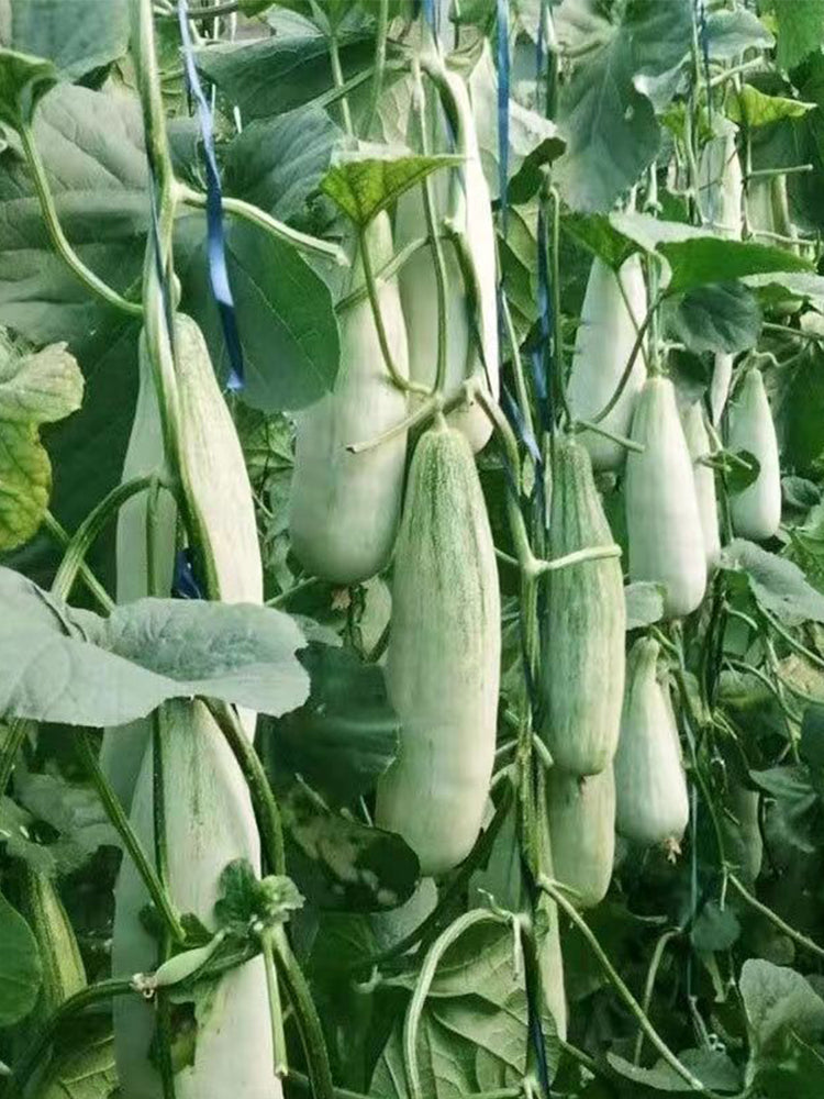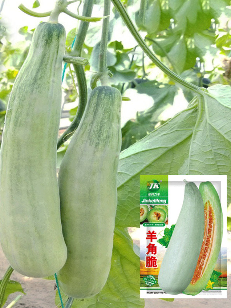 - The melon is a medium-early maturing variety, which is easy to manage. The fruit is horn-shaped. The skin of young melons is light green, while the mature skin is light gray-green. The pulp inside the melon is orange-red, and the flesh is green. The fruit is about 26cm long and about 9cm thick. The flesh is 1.5 - 2.1cm thick, and the average single-fruit weight is about 500g.It tastes sweet, crisp and fragrant. It has a thin skin, thick flesh, a small cavity, abundant juice, a high sugar content and good quality. It is not easy to crack and is resistant to transportation.In addition, this variety has strong disease-resistance, good high-yield and stable-yield characteristics, with an average yield of 3000 - 3500kg per mu.