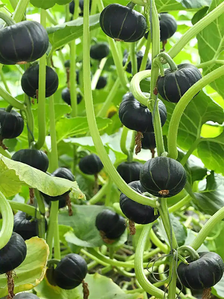 - This early-maturing mini pumpkin variety is known for its dense, floury flesh. The plant exhibits vigorous growth with short internodes and a high capacity for continuous fruit setting, yielding over 10 pumpkins per plant. It demonstrates strong disease resistance and sustained vigor, ensuring a prolonged harvest period. The fruits are ready for harvest 35-40 days after flowering, highlighting their early maturity. They feature an attractive, oblate shape with dark green skin and light green stripes, each weighing 400-500 g, which gives them high marketability. The pumpkin offers an excellent, sweet flavor with a rich, floury aroma and superior quality. Furthermore, vine-training cultivation is recommended to improve fruit shape and taste. The fruits store and transport well and can be preserved for extended periods after air-drying.