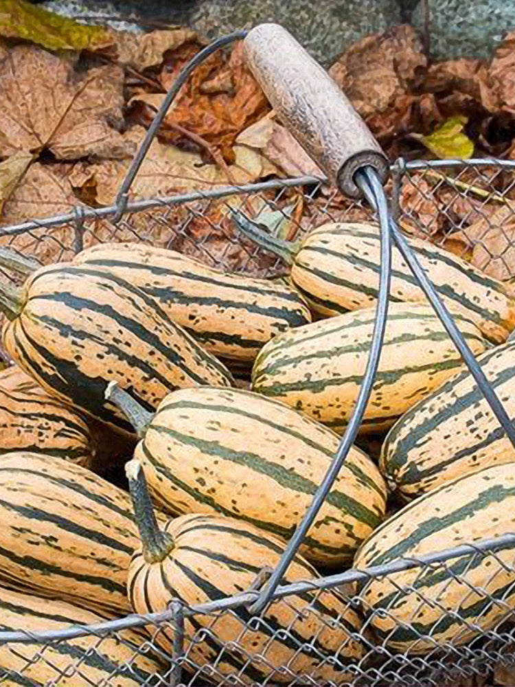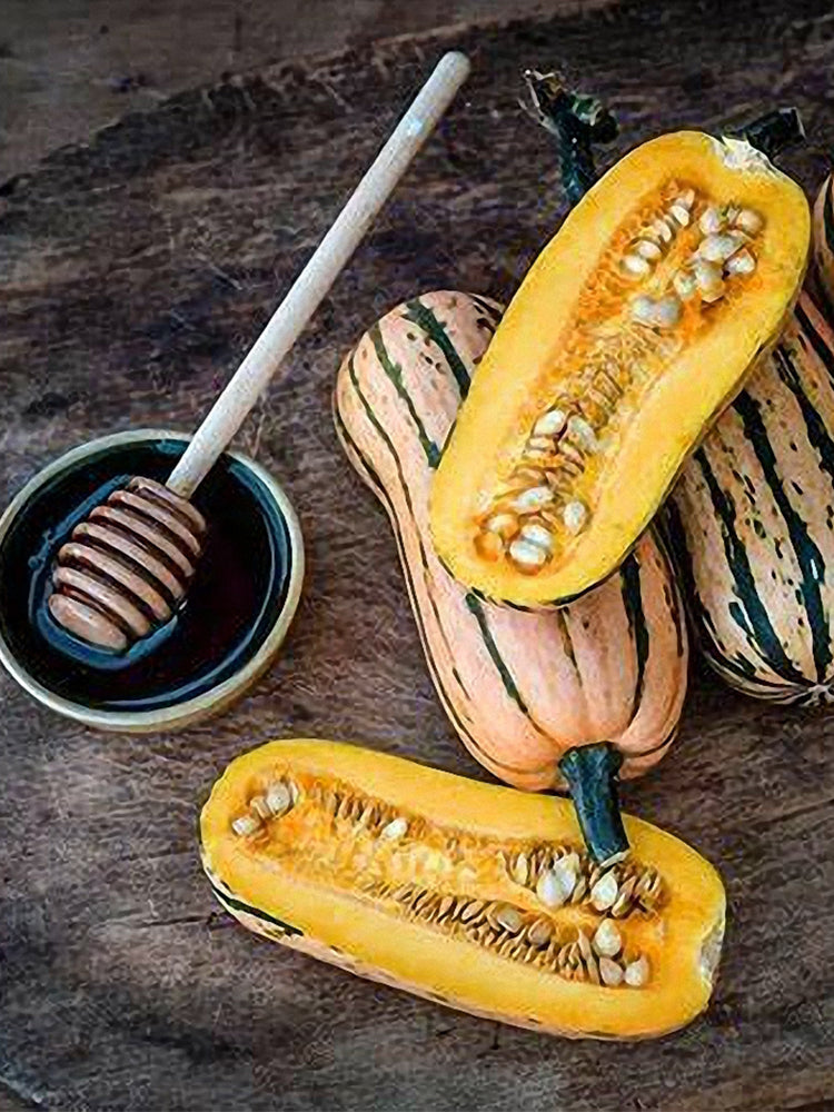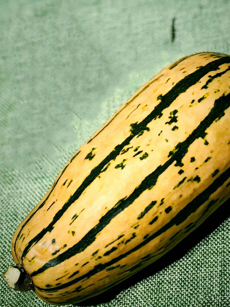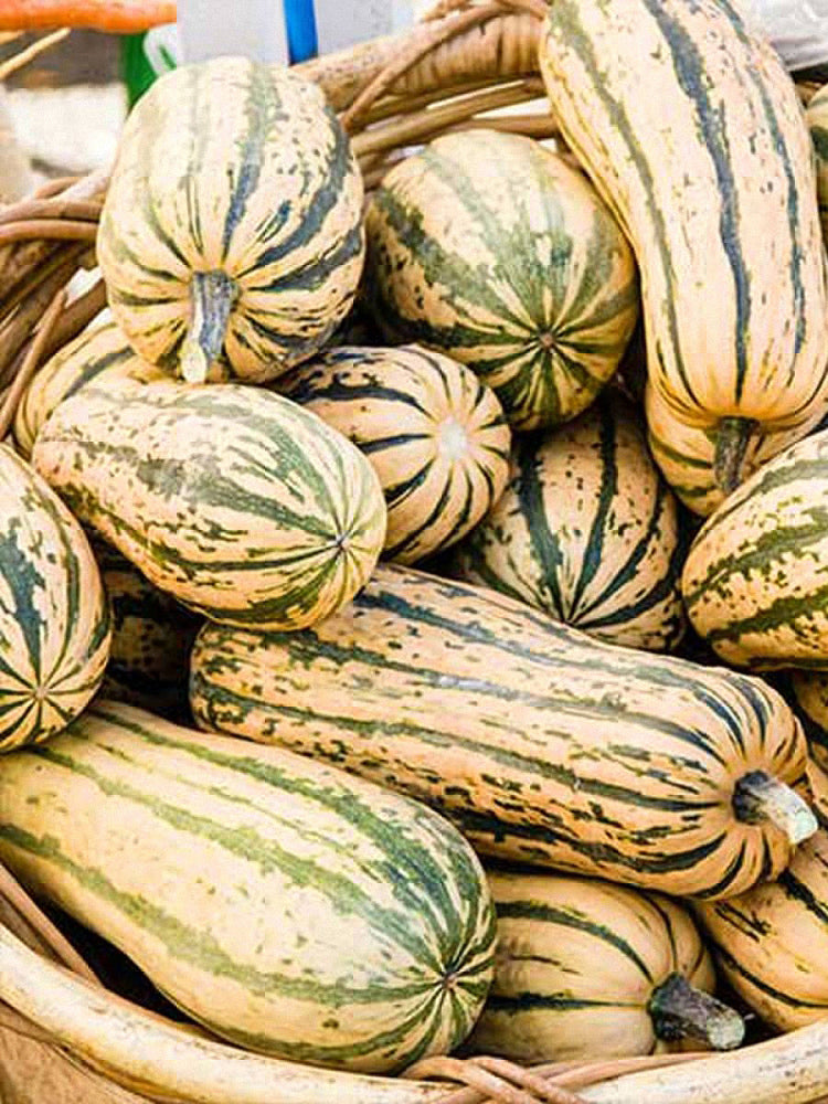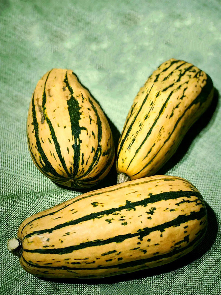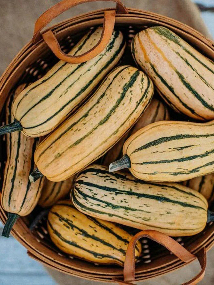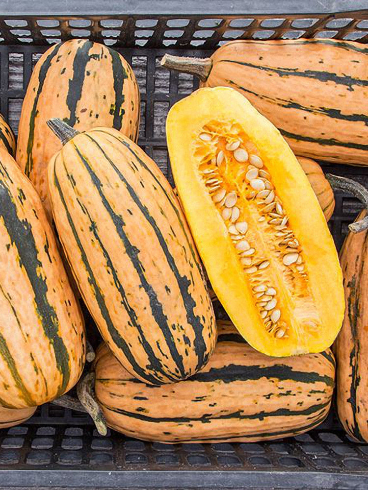 - This delightful golden-orange and green striped delicata squash offers an irresistible sweet, nutty flavor that's perfect for fresh eating, no curing needed! Its vigorous vines reach about 6 feet long, producing abundant, elongated fruits. Each squash weighs approximately 2 pounds, measuring 6 to 8 inches long and 3 inches in diameter. Remarkably easy to store, this variety maintains its honey-like sweetness even during prolonged storage.