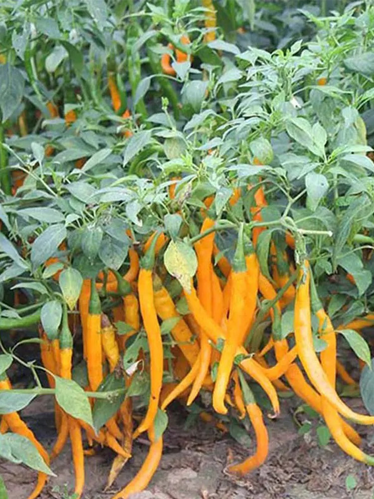 - This mid-early maturing variety exhibits vigorous growth and a compact plant type. The long, linear fruits are light yellow, turning golden yellow upon maturity, with excellent gloss. Fruits measure approximately 20 cm in length and 1.6 cm in diameter, with an approximate weight of 20 g. They are smooth, straight, and uniform in shape from stem to tip, offering an intensely spicy flavor with a unique aroma. The high-quality fruits have a firm texture, ensuring excellent storability and good transportation performance. Fresh pepper yield can reach 3,500 kg per mu, making it suitable for both fresh consumption and processing. The variety shows broad adaptability and strong disease resistance.