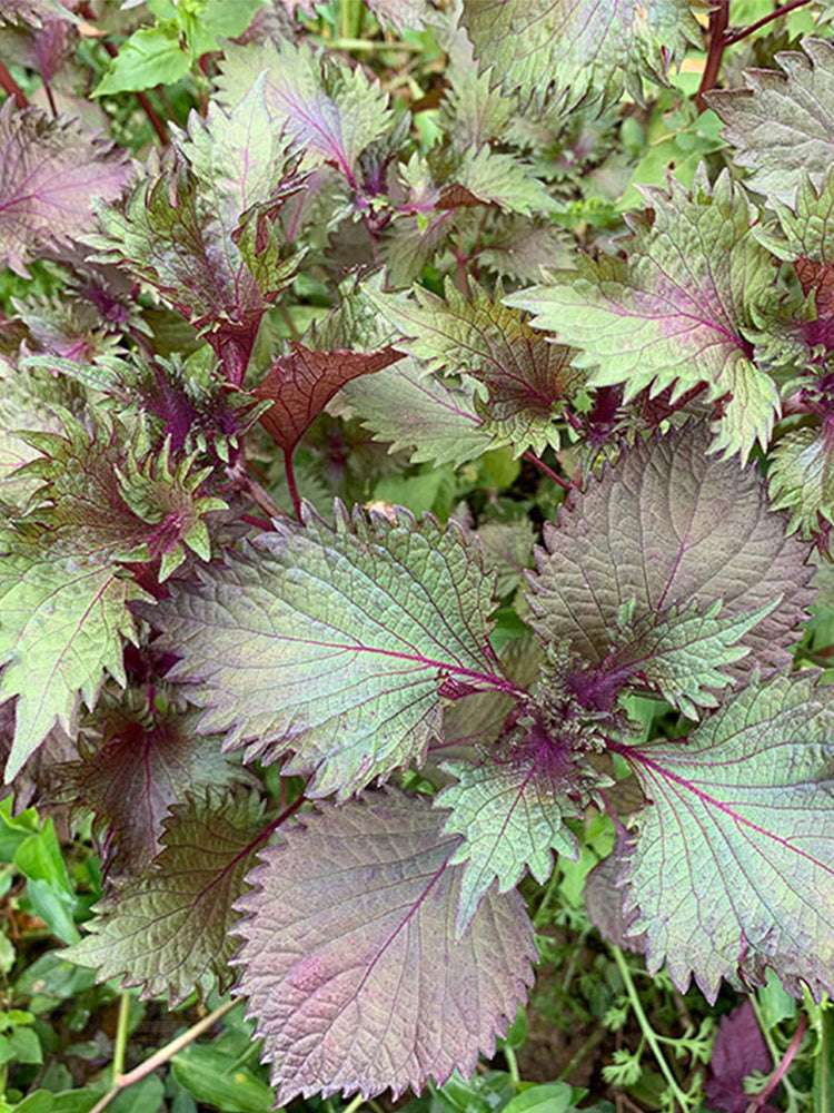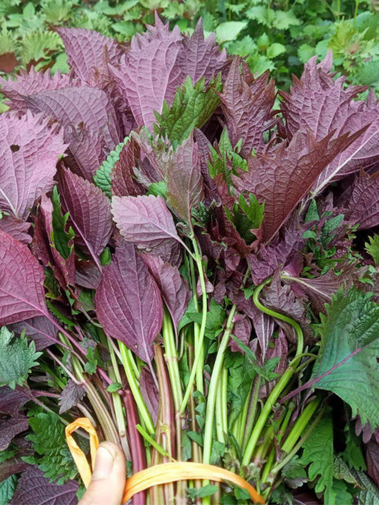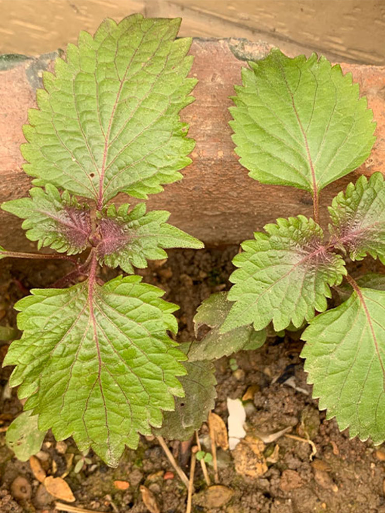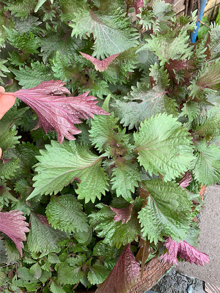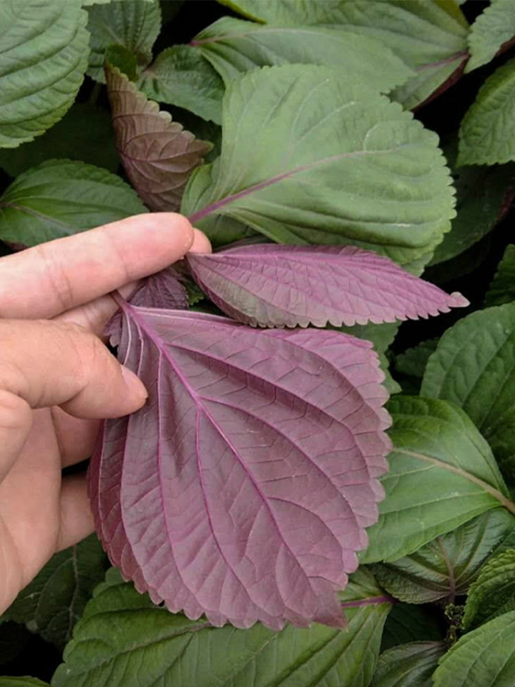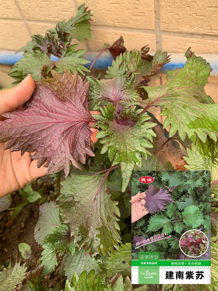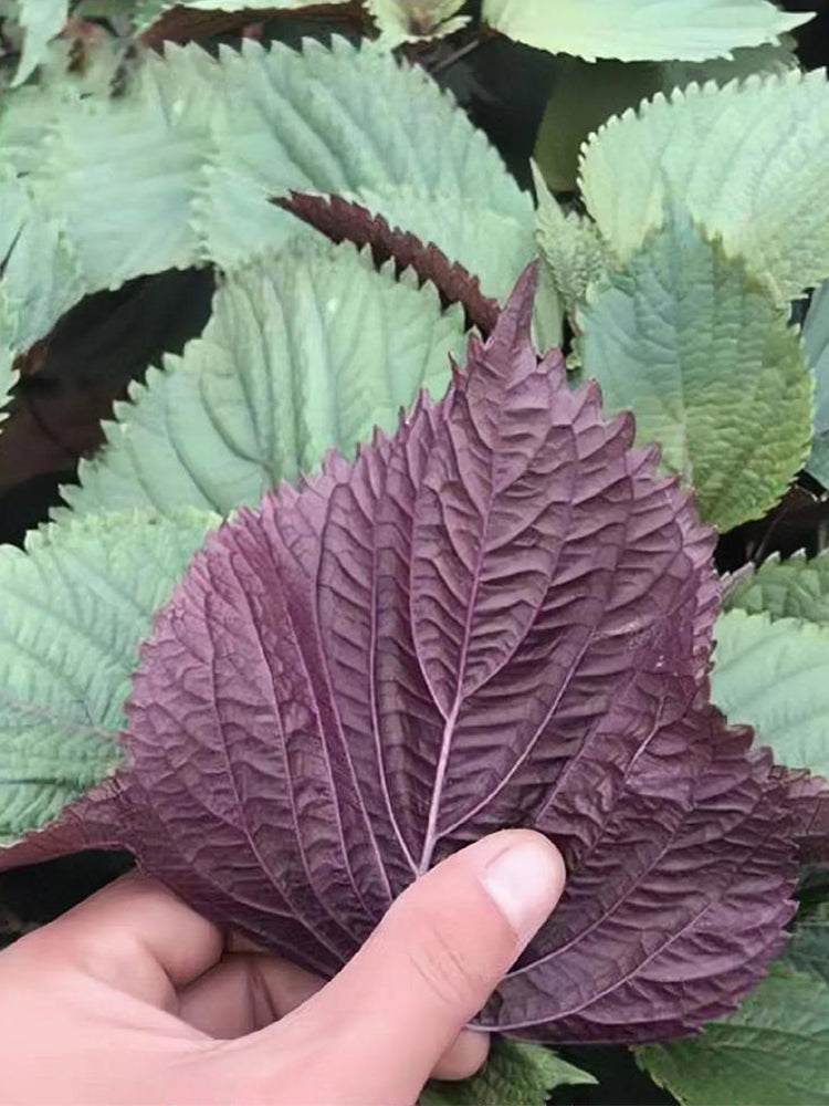 - The stem of this variety is quadrangular and covered with soft hairs. Both the stems and leaves are green during the seedling stage. It grows rapidly and has a strong branching capacity. When it reaches maturity, the front side of the leaves is green while the back side is purple. The serrations on the leaf margins are more pronounced compared to those in the seedling stage, presenting a unique cockscomb shape. It gives off a rich fragrance, and the aroma intensity is significantly higher than that of common perilla. It is especially suitable as a seasoning for removing the fishy odor from seafood. It serves as an essential seasoning spice for both hotel kitchens and home gardening.