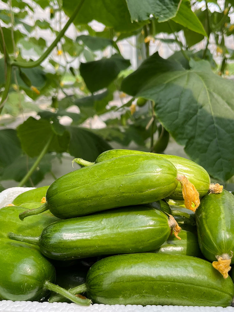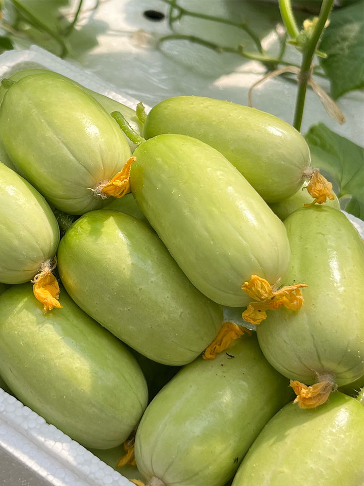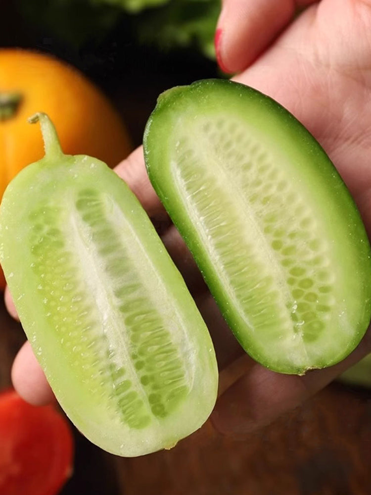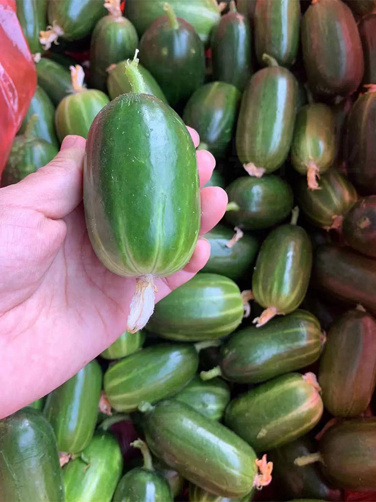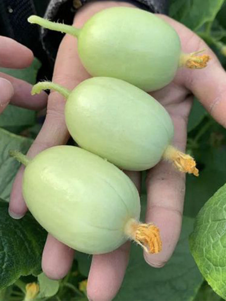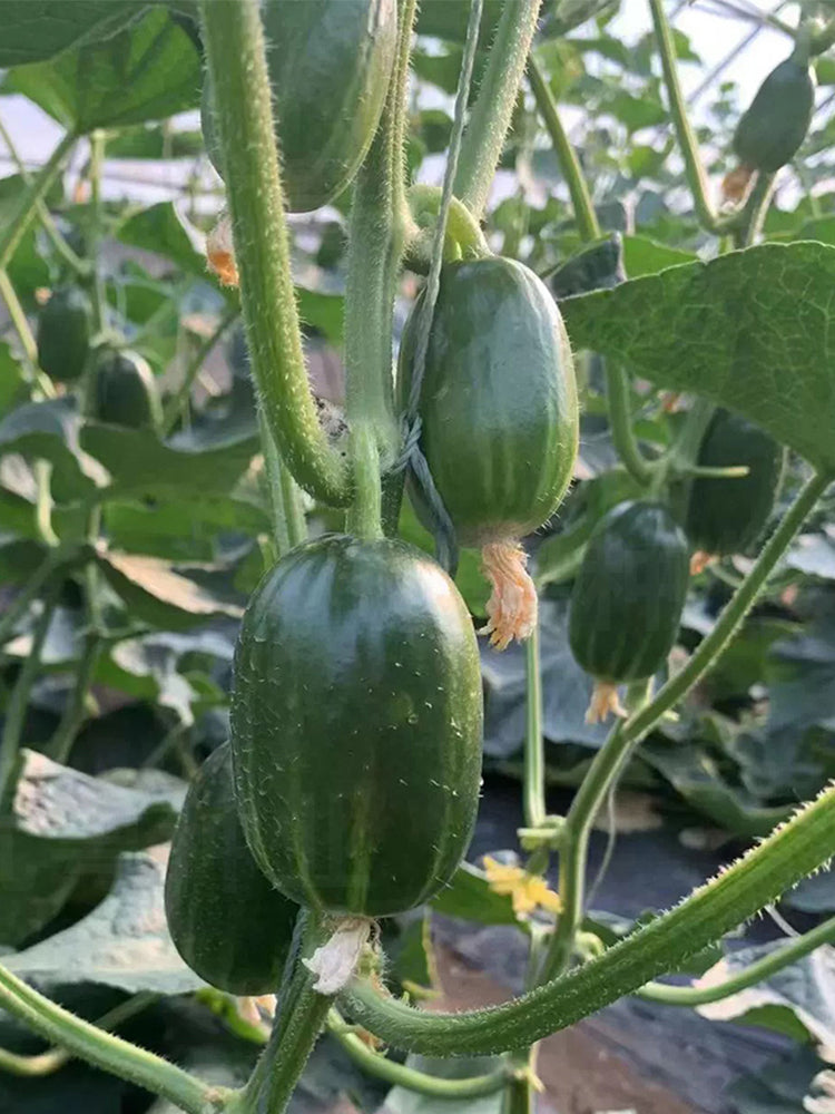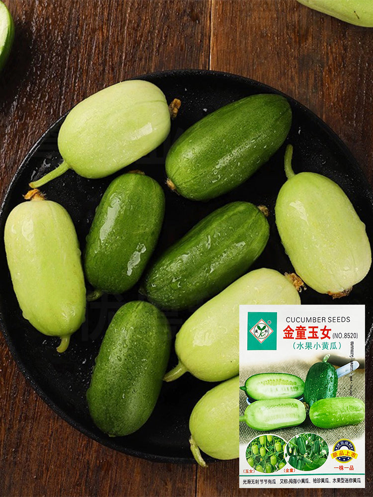 - "Jintong" and "Yunv" are two ultra-small fruit cucumber varieties, both oval in shape with smooth, thornless, and shiny surfaces. They feature a crisp, sweet, and refreshing taste, are strong monoecious varieties (with dominant male flowering), and are extremely early-maturing, with fast melon expansion and strong continuous fruit-setting ability. Each node produces 1-2 melons; commercial melons are 4-6 cm long, stemless, weighing 20-30 g on average; internodes are 8-10 cm in length. These varieties are tolerant to low temperatures and weak light, suitable for autumn-winter or winter-spring cultivation under optimal temperature conditions. The main difference between them is fruit color: "Jintong" has bright green melons, while "Yunv" has pale white melons.