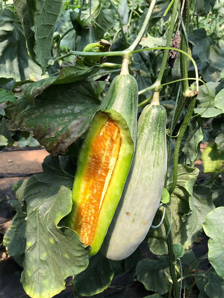- This new variety belongs to the horn-shaped melon type. The fruits are distinctively horn-shaped with an attractive appearance and, at maturity, display a pale white or grayish-green rind. They are known for their high quality, offering a delightful combination of fragrance, crispness, and crunch. The flesh is tender and juicy, contributing to an overall appealing flavor. Individual fruits weigh 0.5-1.0 kg with high overall yields. The variety demonstrates strong disease resistance and broad adaptability. It is well-suited for early spring cultivation in greenhouses and large arch tunnels, as well as for open-field cultivation in the spring. Timely harvesting is essential. To protect fruit quality and yield, cultivation should be avoided during seasons characterized by high temperature, high humidity, and heavy rainfall.