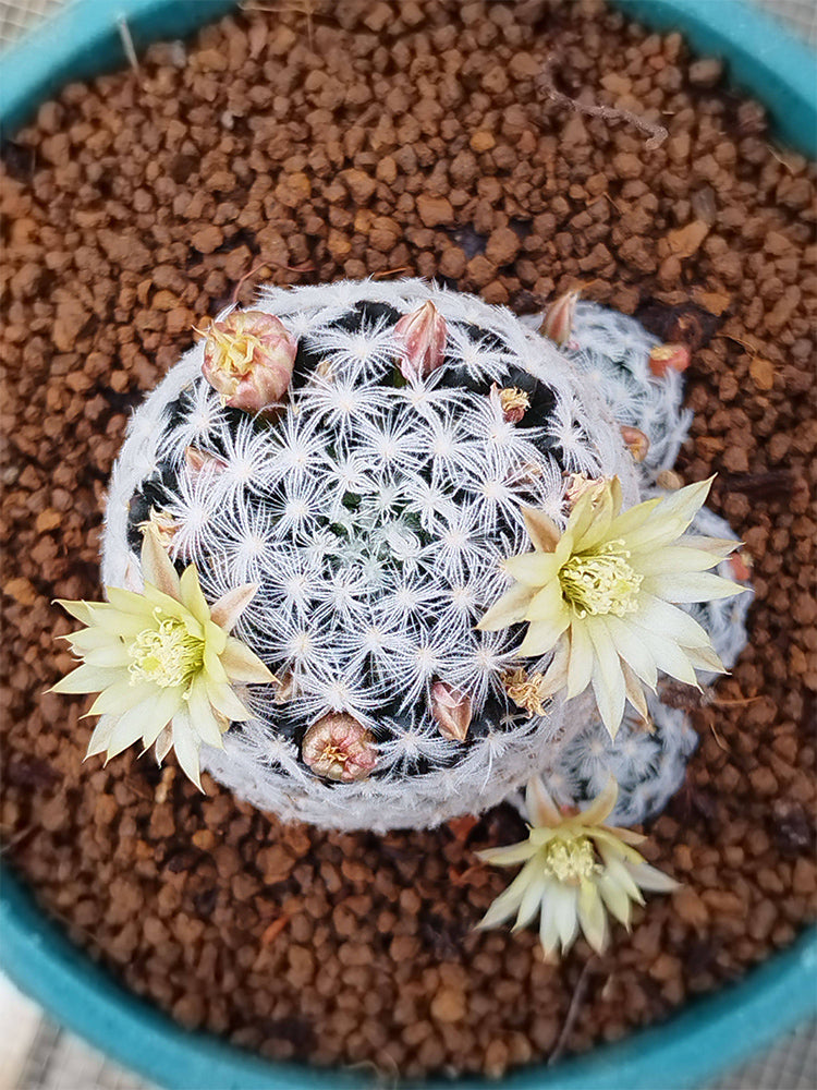 Mammillaria duwei (commonly known as Duwei Pincushion Cactus) is a compact, globular cactus. Belonging to the Mammillaria genus, it is celebrated for its intricate, snow-white, star-like radial spines that create a soft, velvety appearance—so gentle they won't prick your fingers. This slow-growing, miniature cactus forms a tight, symmetrical sphere that rarely exceeds 10 cm in diameter, making it perfect for small spaces. In spring and summer, it produces delicate, pale yellow, daisy-like flowers that contrast beautifully against its silvery-white foliage, adding a charming pop of color to your indoor or outdoor display.