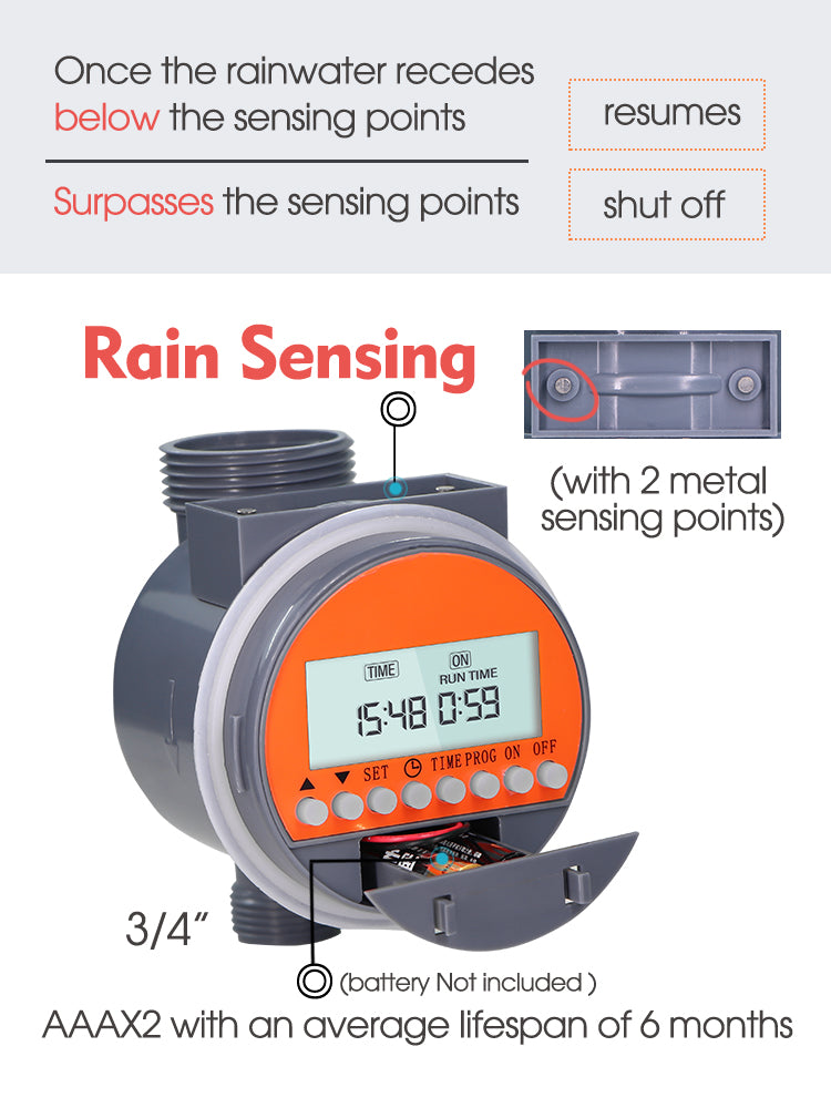 🌱 Ball Valve Design with Rain Sensing Technology: Unlike conventional electromagnetic valve timers, this advanced timer boasts a unique ball valve design. This design makes it ideal for timed irrigation in various settings, including ton barrels, water tanks, and environments with zero pressure conditions. Moreover, it is suitable for timed irrigation under pressures up to 8 bar (115 PSI), such as garden faucets, expanding its applicability across a wide range of irrigation needs. The innovative rain sensing feature, located at the top of the timer, includes a water tank with 2 metal sensing points. When rainwater surpasses these points, the timer system automatically shuts off, ensuring water conservation and efficient irrigation management. Once the rainwater recedes below the sensing points, the timer resumes its preset programs, guaranteeing effective and automated irrigation.