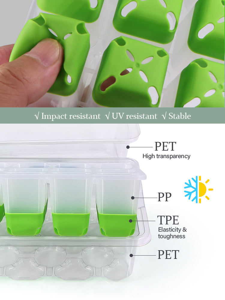 🌱 High-Quality Materials: The colored base of the seed tray is made from flexible and durable TPE material, which ensures long-term use and ease of handling. The semi-transparent tray is crafted from PP material, while the cover and water tray are made from PET, providing high transparency for easy observation of seedling growth. The kit includes 12 flexible pop-out cells made of TPE, which protect seedlings and minimize root damage during transplanting.