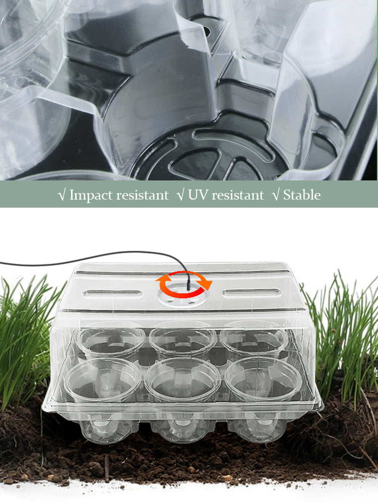 🌱 Transparent PET Material: The tray, lid, and nursery cups are made from high-quality, durable transparent PET material. This allows for easy monitoring of your plant's growth without disturbing the environment. The lid features adjustable vents that enable you to control airflow, humidity, and temperature, creating the perfect growing conditions for your plants. The sturdy construction ensures longevity, making it suitable for multiple growing cycles.