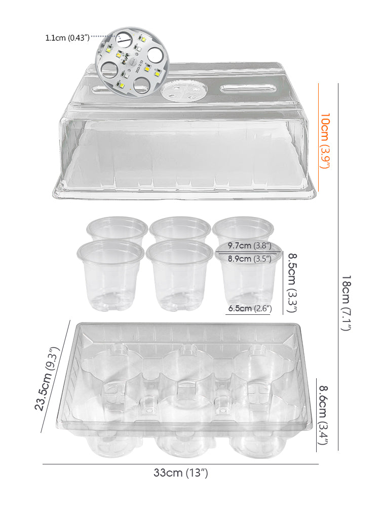 🌱 Tray & Cup Dimensions: The overall assembly size of the N294 Tray Kit is 33 cm (L) x 23.5 cm (W) x 18 cm (H) (13''x9.3''x7.1''), providing ample room for your plants to thrive. Each nursery cup is 8.5 cm (3.3'') tall, with a top outer diameter of 9.7 cm (3.8''), an inner diameter of 8.9 cm (3.5''), and a bottom diameter of 6.5 cm (2.6''). The tray height is 8.6 cm, and the transparent lid measures 10 cm (3.9'') in height, ensuring excellent airflow and humidity control to support each stage of plant growth.