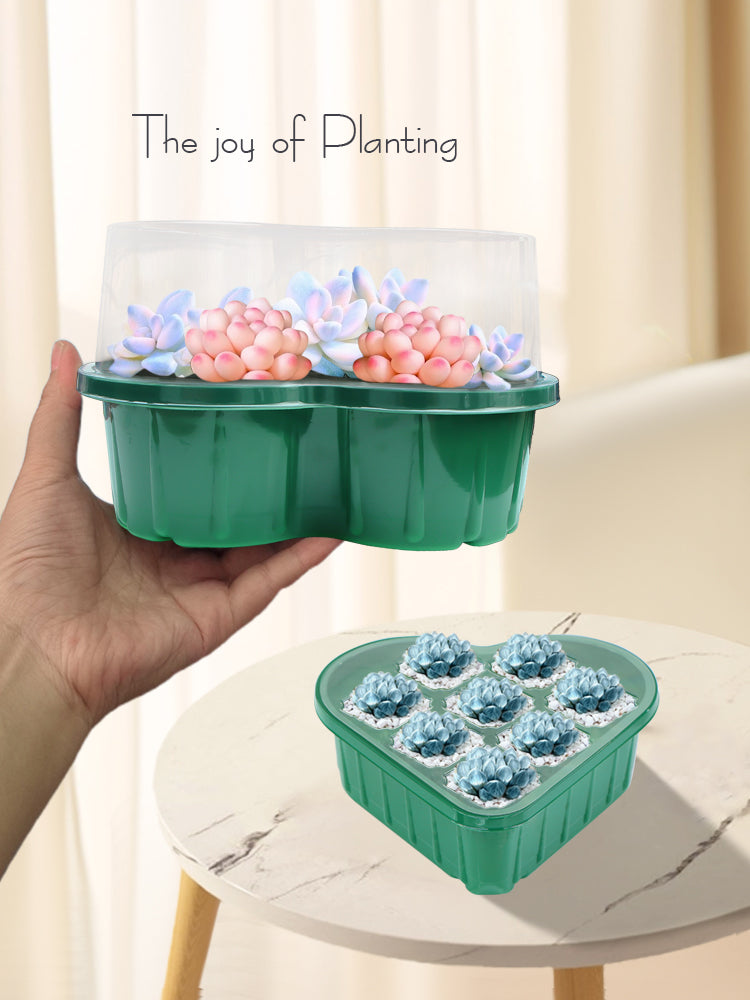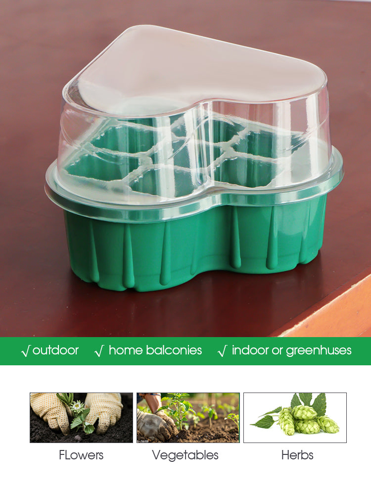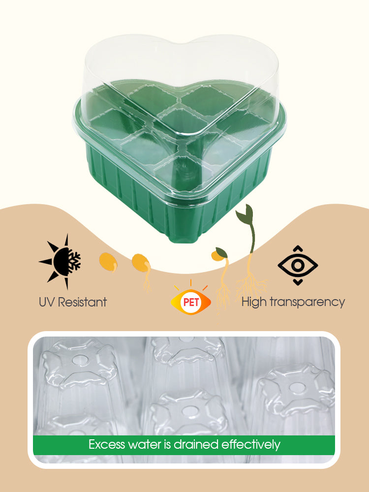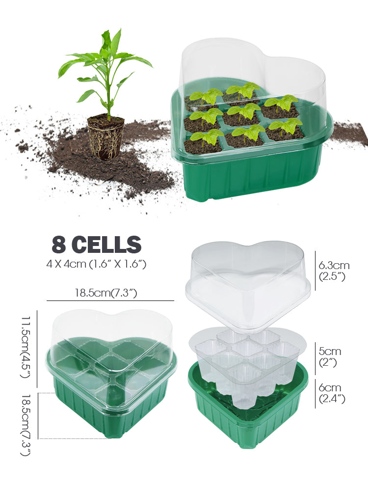 This heart-shaped seedling tray, made of eco-friendly PET, features 8 drainage holes and a transparent lid for optimal growth conditions. Perfect for home gardening, balconies, and greenhouses.