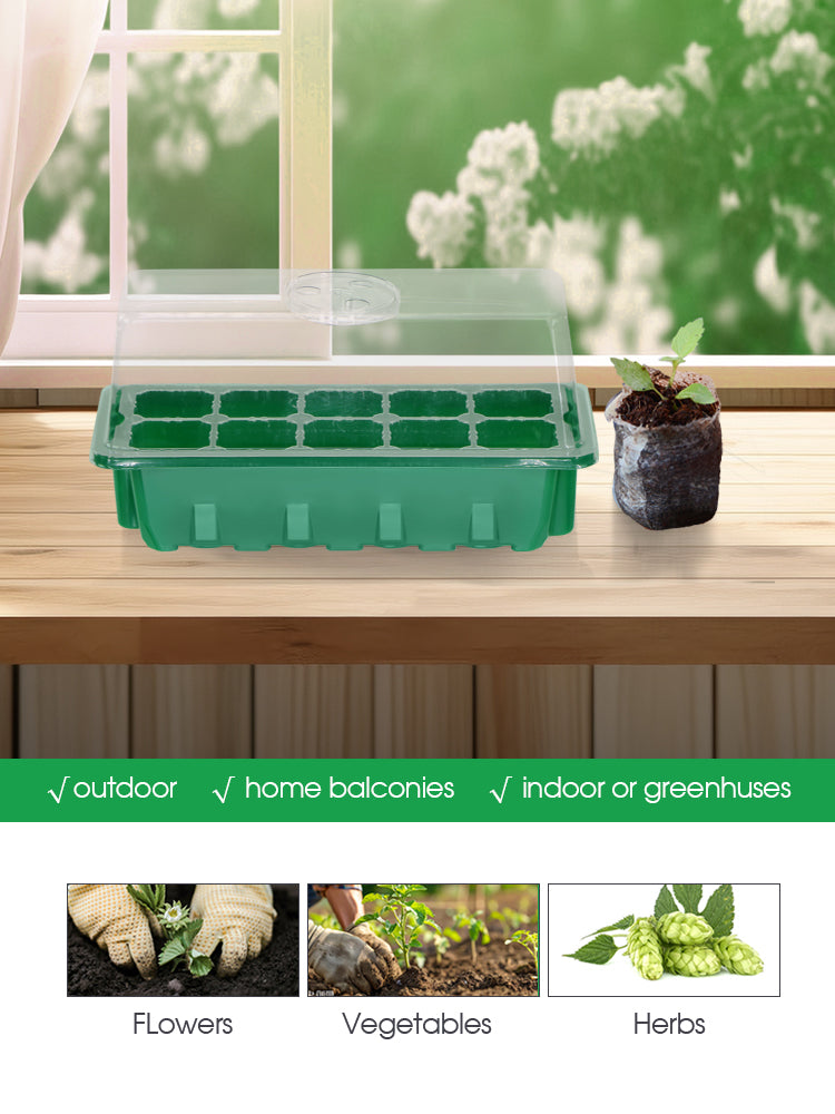 🌱 Rectangular Design: This seedling tray features a modern rectangular design with assembled dimensions of 24cm (9.4'') in length, 10cm (3.9'') in width, and 12cm (4.7'') in height. The compact structure is space-saving, making it ideal for home gardening or balcony use. The tray is made from durable green PET material, while the transparent seed tray and lid allow you to monitor plant growth effortlessly.