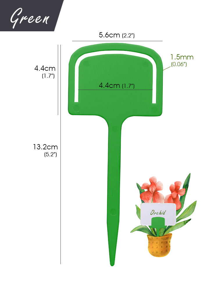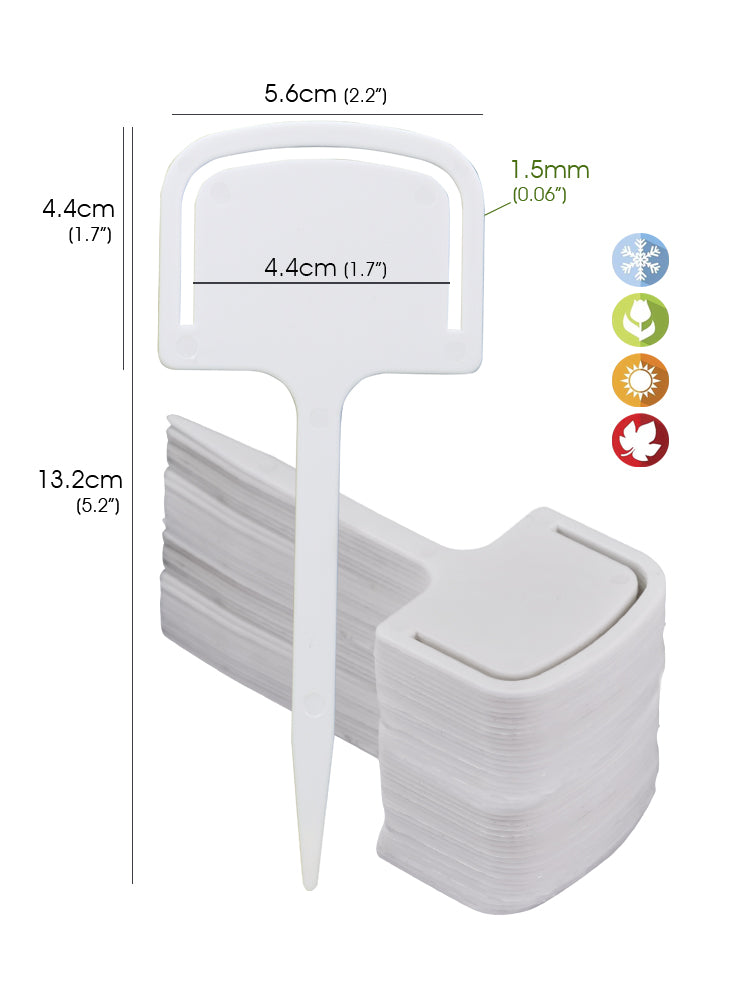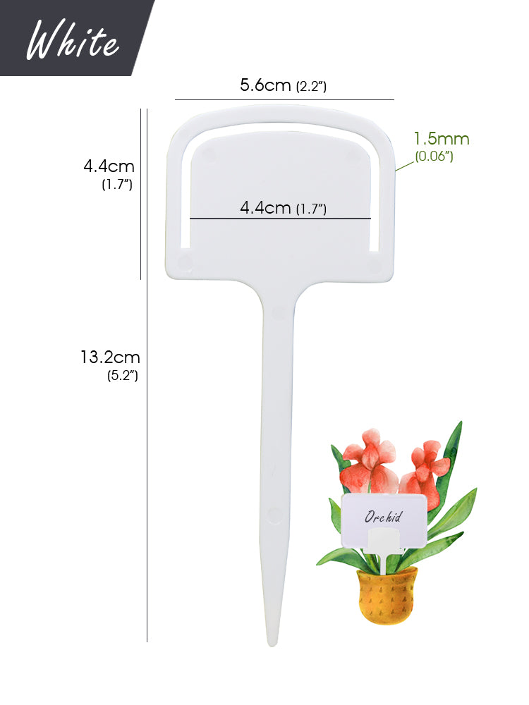 🌱 T-shaped Insertable Label: Available in two colors, white and green. The total height of the label is 13.2 cm (5.2''). The label face measures 5.6 cm (2.2'') in length and 4.4 cm (1.7'') in width, with an edge thickness of 1.5 mm (0.06''). Each label weighs approximately 3.7 grams (0.13 oz), making it lightweight and easy to handle.