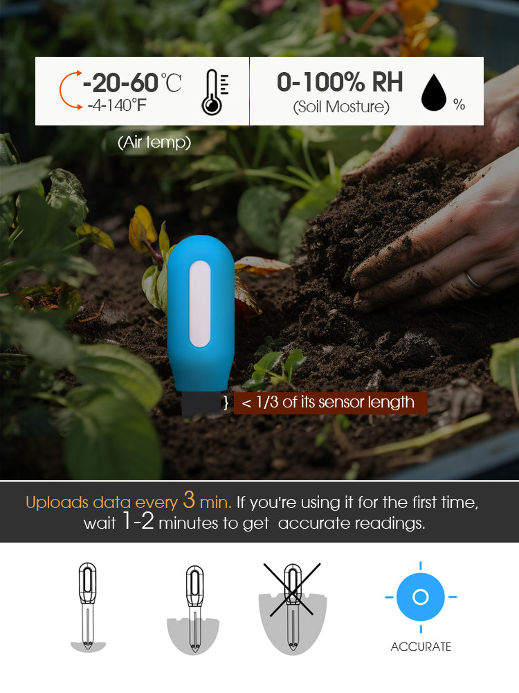 🌱 Real-Time Monitoring: Uploads data every 3 minutes to monitor soil moisture and air temperature. The temperature range is from -20°C to 60°C (-4°F to 140°F), and the soil moisture range is from 0-100%, ensuring optimal environmental conditions for plant growth.