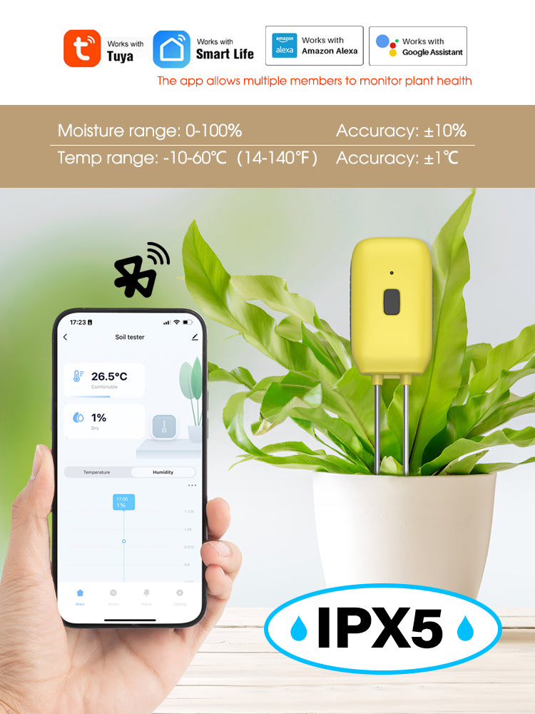 🌱 Smart Home Compatible: The N323 Bluetooth Soil Sensor is compatible with Amazon Alexa and Google Assistant, enabling voice control. Create device groups and share access with family members for an enhanced gardening experience.