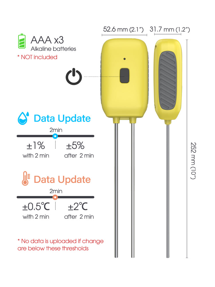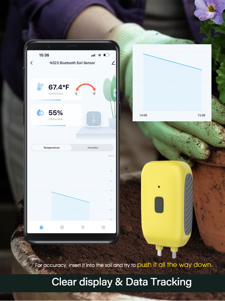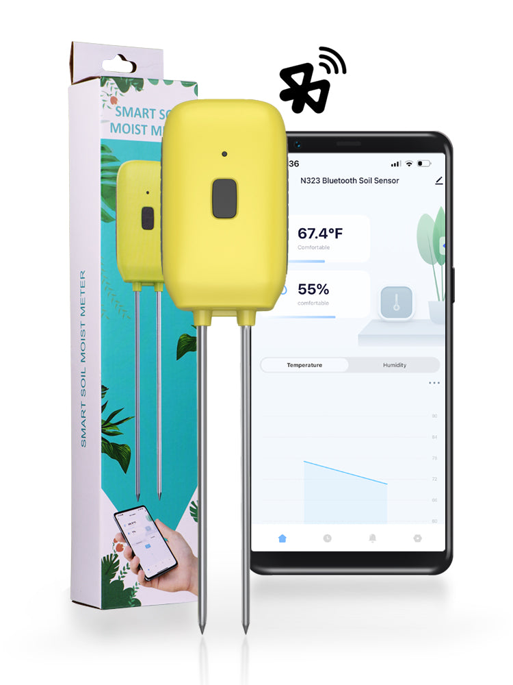 The N323 Bluetooth Soil Sensor offers precise monitoring of soil temperature (-10°C to 60°C / 14°F to 140°F) and moisture (0% to 100%) using high-sensitivity zinc alloy probes. With Bluetooth connectivity, it allows easy real-time data tracking. The sensor features an intuitive display, customizable units, and stores up to a year of historical data. It's IPX5 waterproof, durable, and works seamlessly with Amazon Alexa and Google Assistant for smart home integration. Ideal for both indoor and outdoor gardening, it ensures efficient plant management with alerts for battery life.
