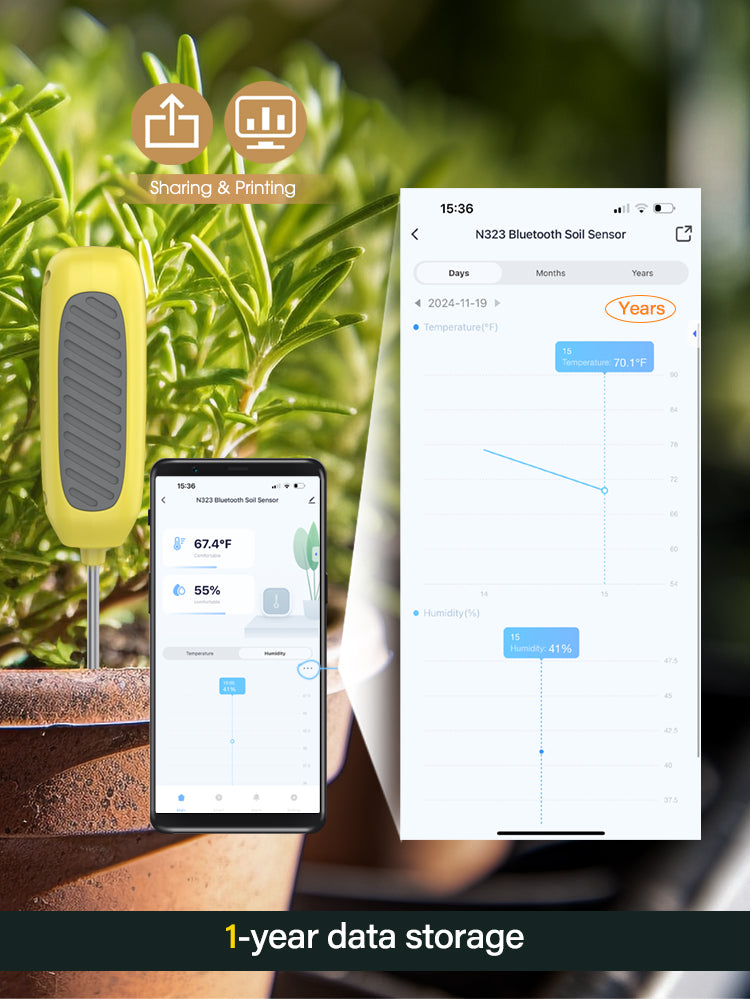 🌱 Clear Display & Data Tracking: Equipped with an intuitive interface, the sensor displays soil temperature and moisture clearly. View daily, monthly, and yearly historical records (up to 1-year data storage) to track soil changes and manage your planting effectively.
