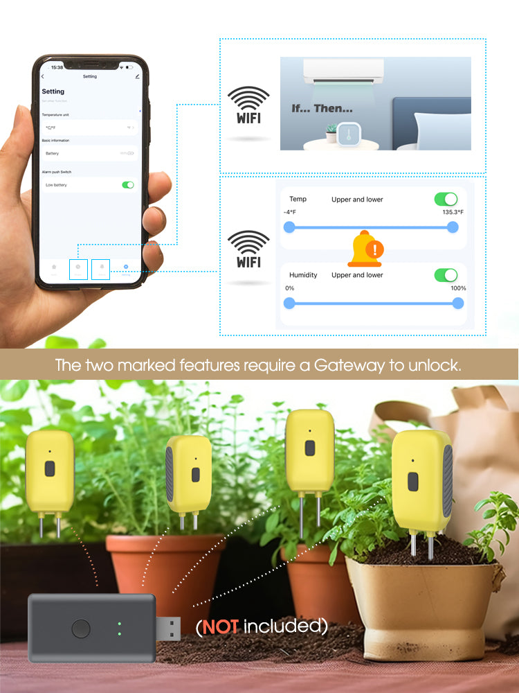 🌱 Accurate Bluetooth Monitoring: The N323 Bluetooth Soil Sensor measures soil temperature (-10°C to 60°C / 14°F to 140°F) and moisture (0% to 100%) with high sensitivity zinc alloy probes, ensuring rapid response and precision. Connect via Bluetooth to monitor real-time data easily. Note: Gateway not included for remote access, a Bluetooth gateway is required.