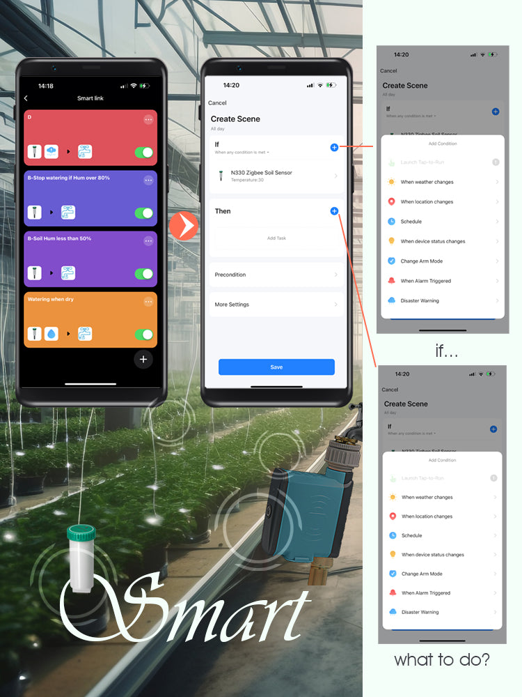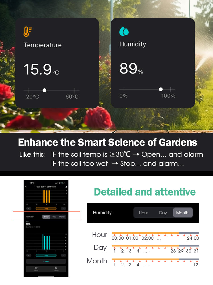 - Automatically water or stop watering by linking with a smart irrigation timer based on soil humidity or temperature conditions;