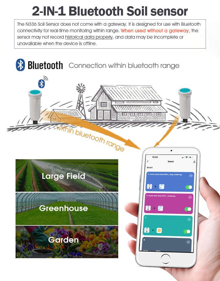 The N336 Soil Sensor does not come with a gateway. It is designed for use with Bluetooth connectivity for real-time monitoring within range. When used without a gateway, the sensor may not record historical data properly, and data may be incomplete or unavailable when the device is offline.