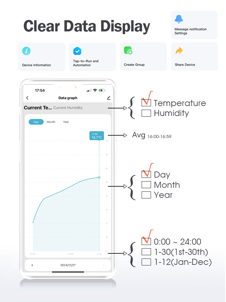 🌱 User-Friendly APP Interface: The intuitive app displays real-time temperature and humidity data with a clear font. When connected to a gateway (NOT included), the app also provides historical records: