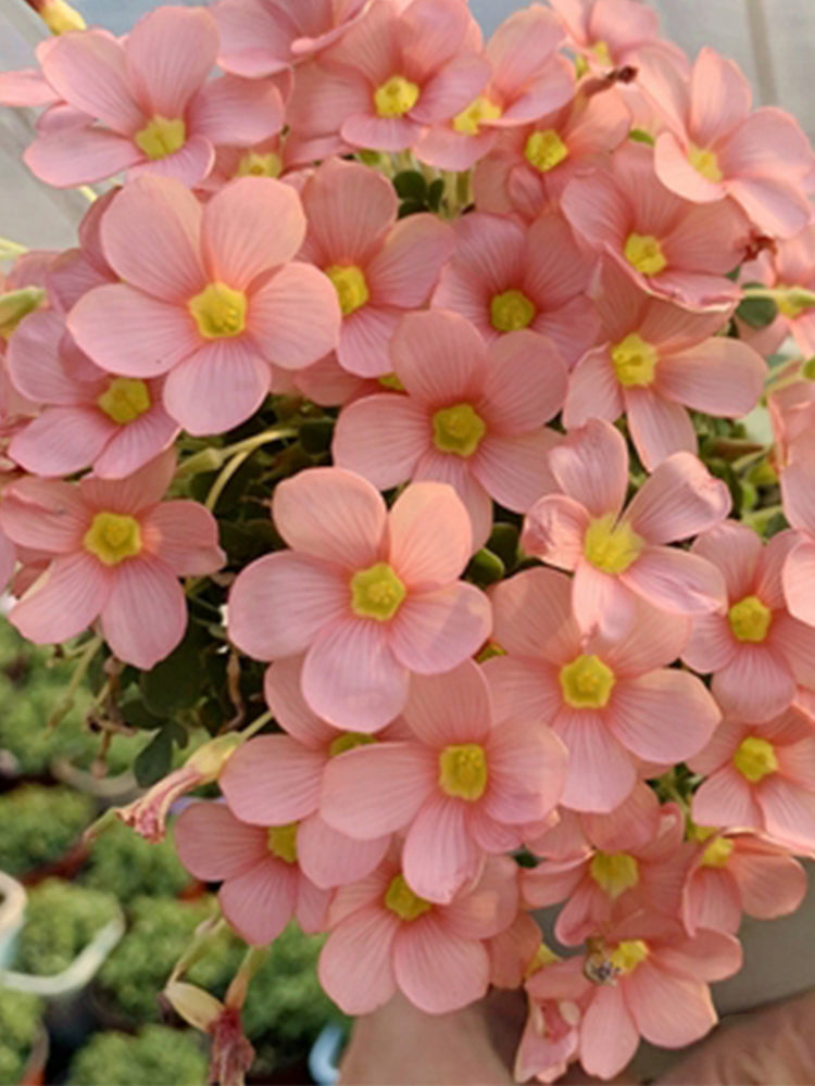 Oxalis convexula showcases an abundance of charming, soft pink flowers with delicate, slightly deeper pink veining that radiate from a vibrant yellow center. Each bloom features five petals, creating a cheerful, open face. The overall effect is a lush and cheerful display of warm pink hues, creating a delightful contrast with the bright yellow eyes.