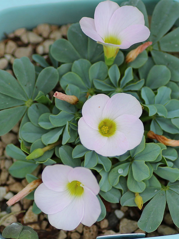 Oxalis flava 'Lavender Form' produces charming lavender-colored blooms with the classic five-petal Oxalis shape. These delicate flowers provide a lovely contrast to its distinctive foliage, adding a gentle pop of color during the cooler months.