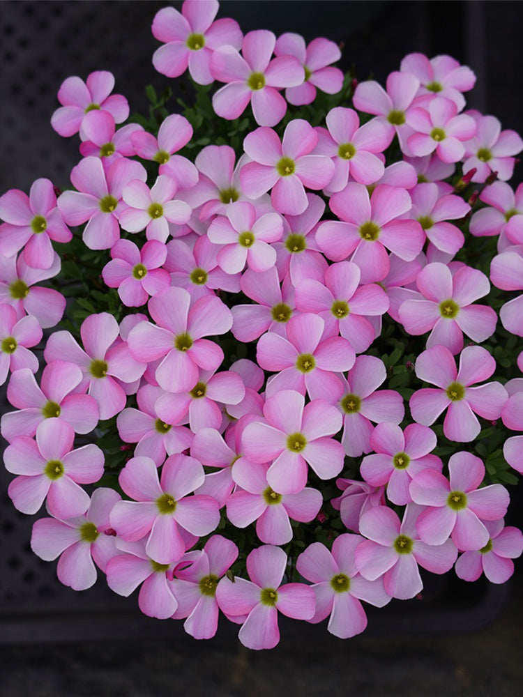 The 'Ice Firefly' Oxalis glabra boasts an enchanting display of vibrant pink blossoms. Each delicate flower features five petals, creating a charming star-like shape. The center of each bloom is accented with a bright, contrasting lime-green pistil, adding a captivating focal point that truly makes these "fireflies" glow. The abundance of these small, brilliant flowers creates a dense, carpet-like effect, bringing a cheerful burst of color.