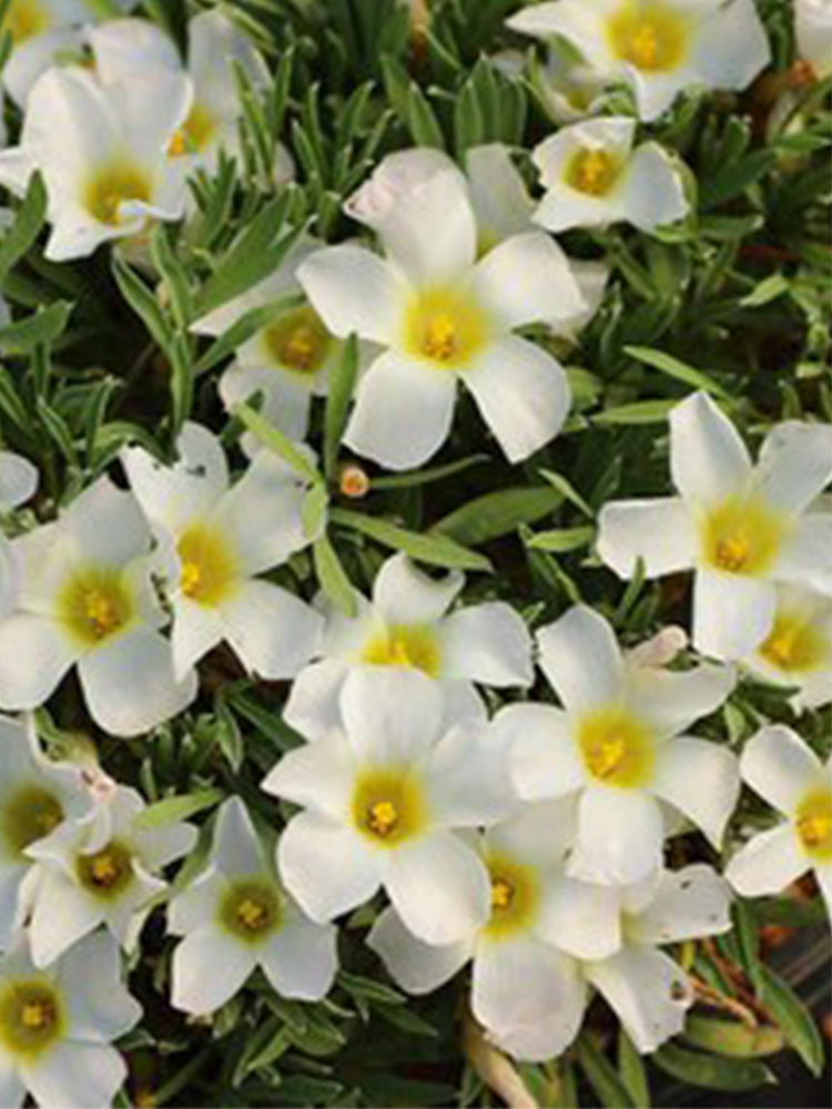 Oxalis massonorum produces an abundance of charming, pure white flowers. Each bloom features five delicate petals that open wide to reveal a vibrant, sunny yellow center, creating a striking contrast. These bright centers often have a subtle green hue at their very core, adding depth to their cheerful appearance. The overall effect is one of crisp elegance and radiant beauty, making them a delightful addition to any collection.