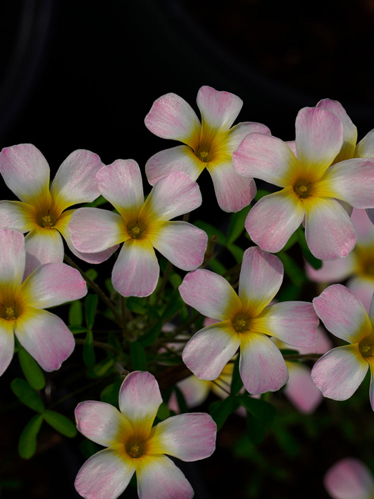 The 'Crescent' Oxalis obtusa showcases exquisite blossoms, each petal a delicate blend of soft pink transitioning into a creamy white at the edges. The heart of each flower boasts a vibrant, buttery yellow, creating a beautiful contrast that illuminates its surroundings. These charming, five-petaled flowers form a delightful display, offering a cheerful splash of color when many other plants are dormant.