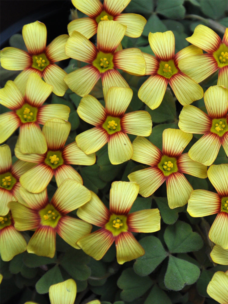 The 'Fire Bird' Oxalis obtusa boasts captivating blossoms that ignite your garden with vibrant color. Each flower features five distinct petals in a radiant golden yellow hue, radiating outwards from a striking center. The heart of each bloom is accented with deep reddish-pink veins that extend partially along the base of the petals, creating a mesmerizing fiery effect. These cheerful flowers, often appearing in clusters, create a dense and enchanting display against their clover-like foliage.