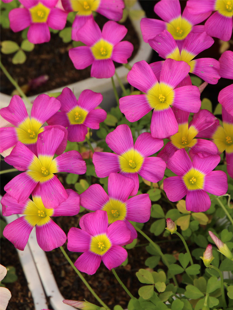 Oxalis obtusa 'Fluorescent Purple' boasts stunning, intensely fluorescent purple petals that radiate with an almost electric glow. Each flower features a striking bright yellow center, creating a beautiful and eye-catching contrast that truly pops. The petals are broad and well-formed, contributing to a full and lush appearance when in bloom. These charming flowers are held aloft on slender stems, creating a delightful display that will brighten any space.