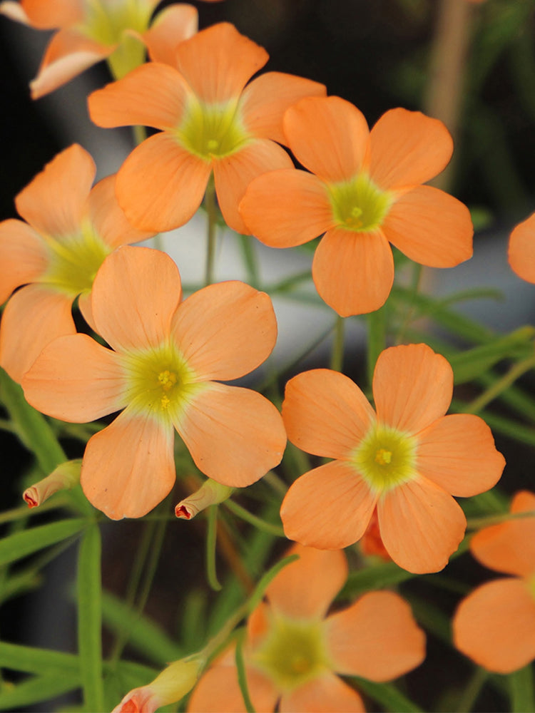 The 'Gracilis' variety of Oxalis obtusa showcases delightful, clear apricot-orange flowers. Each bloom features five petals that unfurl to reveal a bright, contrasting chartreuse-yellow center, adding a cheerful pop of color to your winter and early spring garden or indoor display. The vibrant hue of these flowers is sure to brighten up any space.