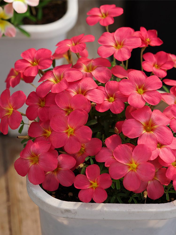 Oxalis obtusa 'Sweet Potato' boasts an enchanting display of vibrant, rich pink flowers. Each bloom features five delicate petals, arranged symmetrically around a bright, golden-yellow center. The vivid pink hue is reminiscent of ripe sweet potatoes, giving this variety its unique and appealing name. The petals often display subtle variations in shade, adding depth and visual interest to the overall floral cluster. These cheerful blossoms emerge in profusion, creating a stunning and eye-catching spectacle that brightens up any space.