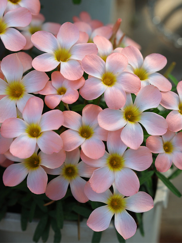 Oxalis obtusa 'Icing' presents an exquisite display of delicate blossoms. Each flower features five broadly ovate petals, radiating a soft, pastel pink hue that gracefully transitions to a creamy white at the base. The petals are adorned with prominent yellow centers, creating a captivating contrast and adding a touch of vibrant warmth. The overall effect is one of sweet elegance, reminiscent of delicate confectionary, hence its fitting 'Icing' name. These charming blooms gather in profusion, forming a delightful cluster that brightens any space.