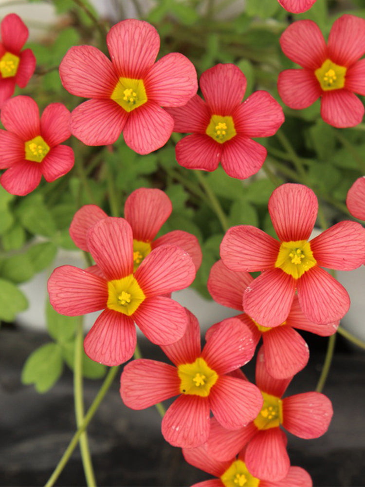 Oxalis obtusa 'Jennie' showcases an abundance of charming salmon-pink to coral-red blooms. Each flower features five delicate petals, creating a star-like shape with a striking bright yellow center, adding a cheerful contrast. The vibrant color of 'Jennie' is captivating, bringing a warm and lively splash of color to your garden or indoor space during the cooler months.