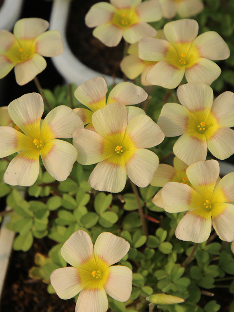 Oxalis obtusa 'Lemon Green' showcases charming, delicate flowers with a beautiful gradient. The petals are a creamy at their edges, transitioning to a vibrant, sunny yellow towards the center, creating a striking contrast. Each flower features a distinct yellow eye, adding to its bright and cheerful appearance. The petals are broad and somewhat heart-shaped, forming a lovely, open bloom.