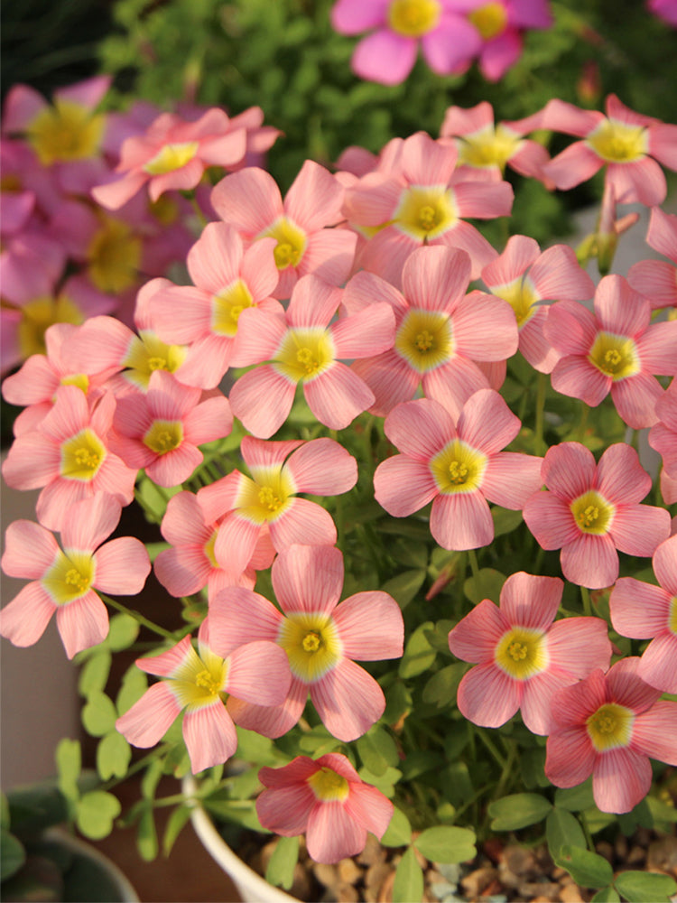 Oxalis obtusa 'Loli' presents a delightful display of charming light pink blossoms, each petal gracefully fanning out to reveal a vibrant yellow-gold center. The soft pink hues create a gentle and inviting appearance, making this variety a cheerful addition to any collection. The flowers are abundant, forming a dense cluster that provides a striking visual impact.