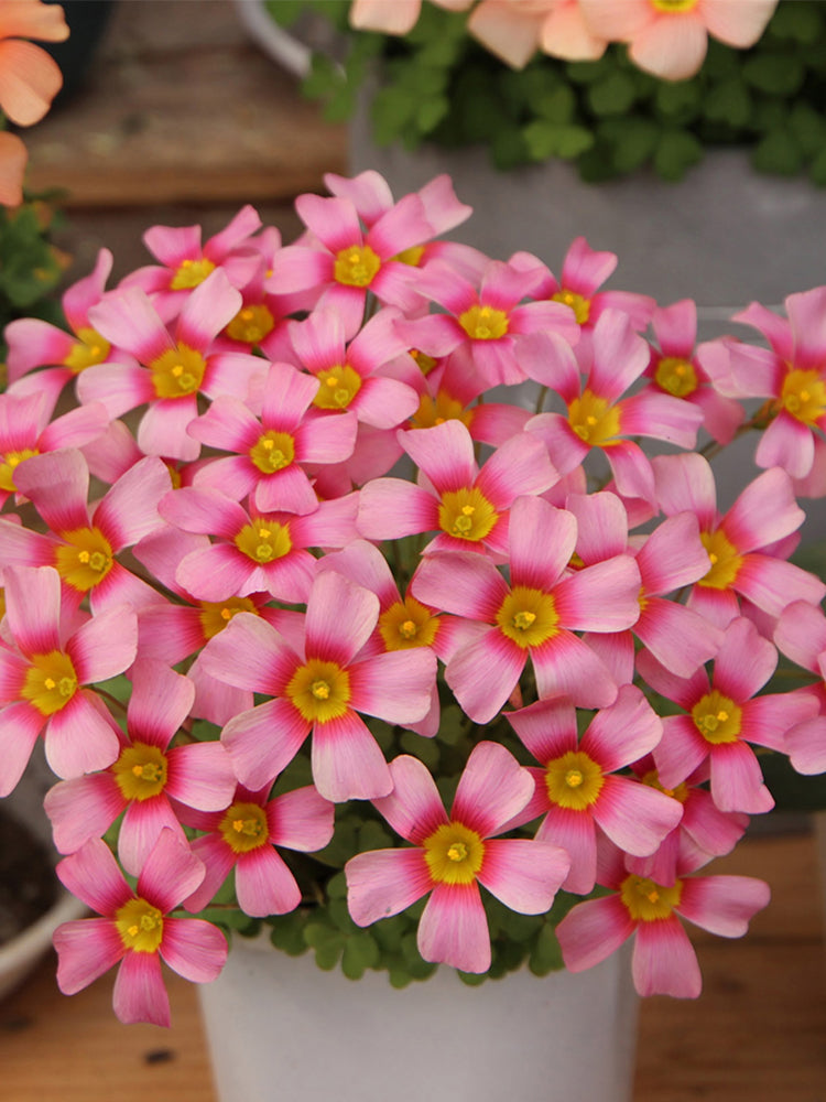 'Nebula' Oxalis obtusa boasts an enchanting display of vibrant pink flowers, each petal delicately edged with a lighter hue, creating a striking contrast. At the heart of each bloom lies a brilliant yellow eye, adding a cheerful pop of color. These charming, cup-shaped flowers form a dense cluster, creating a captivating visual spectacle that brightens up any space.