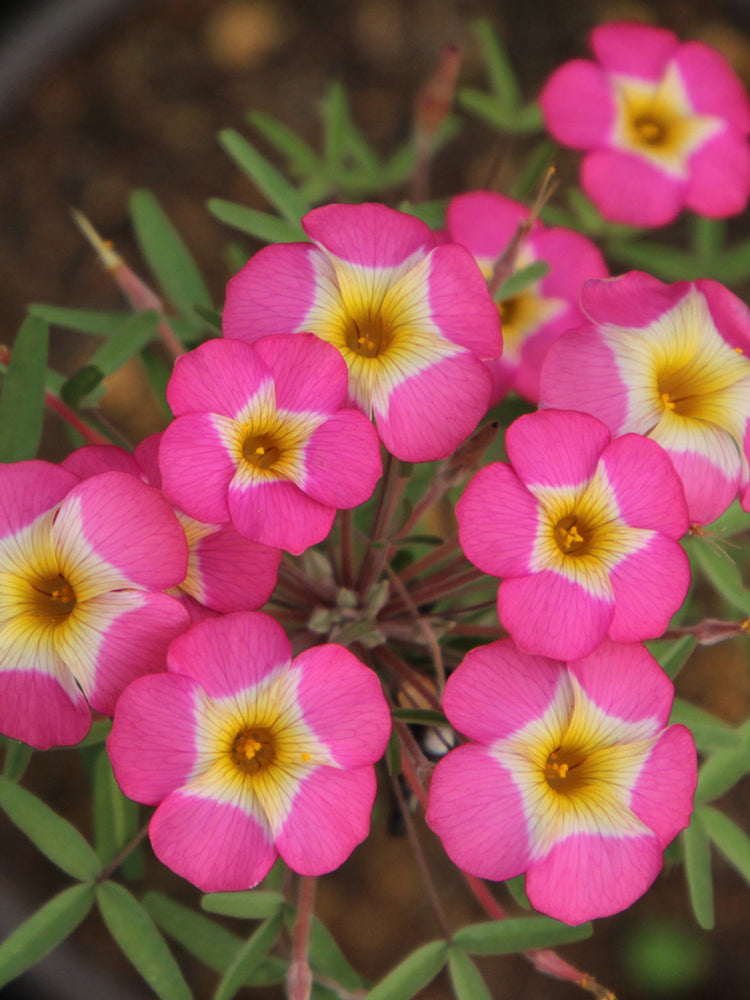 Oxalis obtusa 'Rose Yael' boasts truly captivating blooms. Each flower presents a striking bicolor display, with vibrant, rose pink petals that gently fade to a crisp white and then a bright yellow at the very heart. The distinct yellow eye adds a luminous contrast, making these charming flowers a focal point wherever they are planted. The petals are beautifully formed, creating a star-like pattern that is both delicate and eye-catching, especially when grouped together.